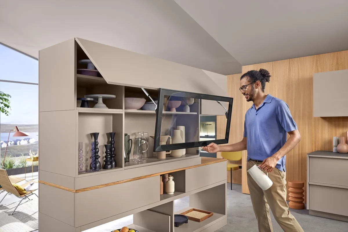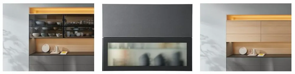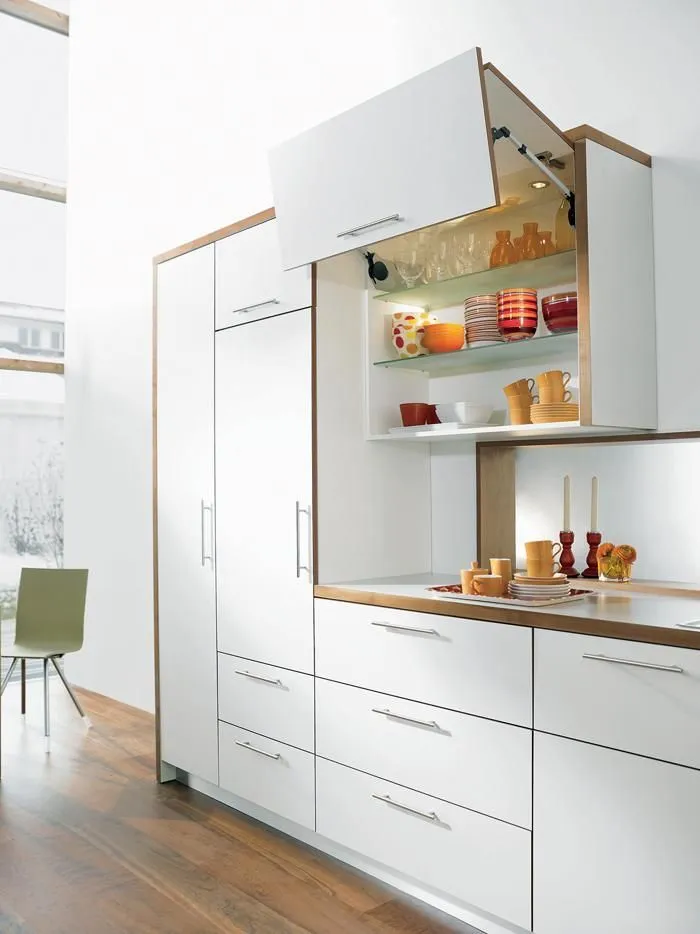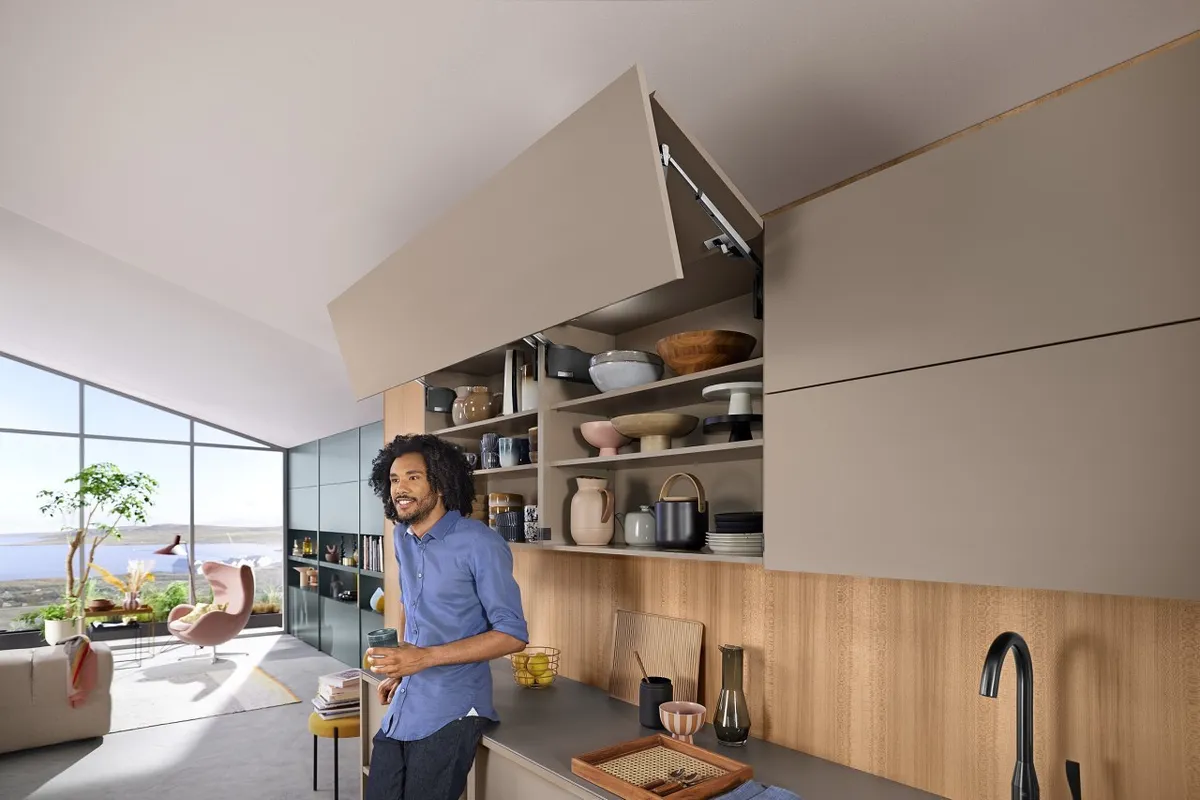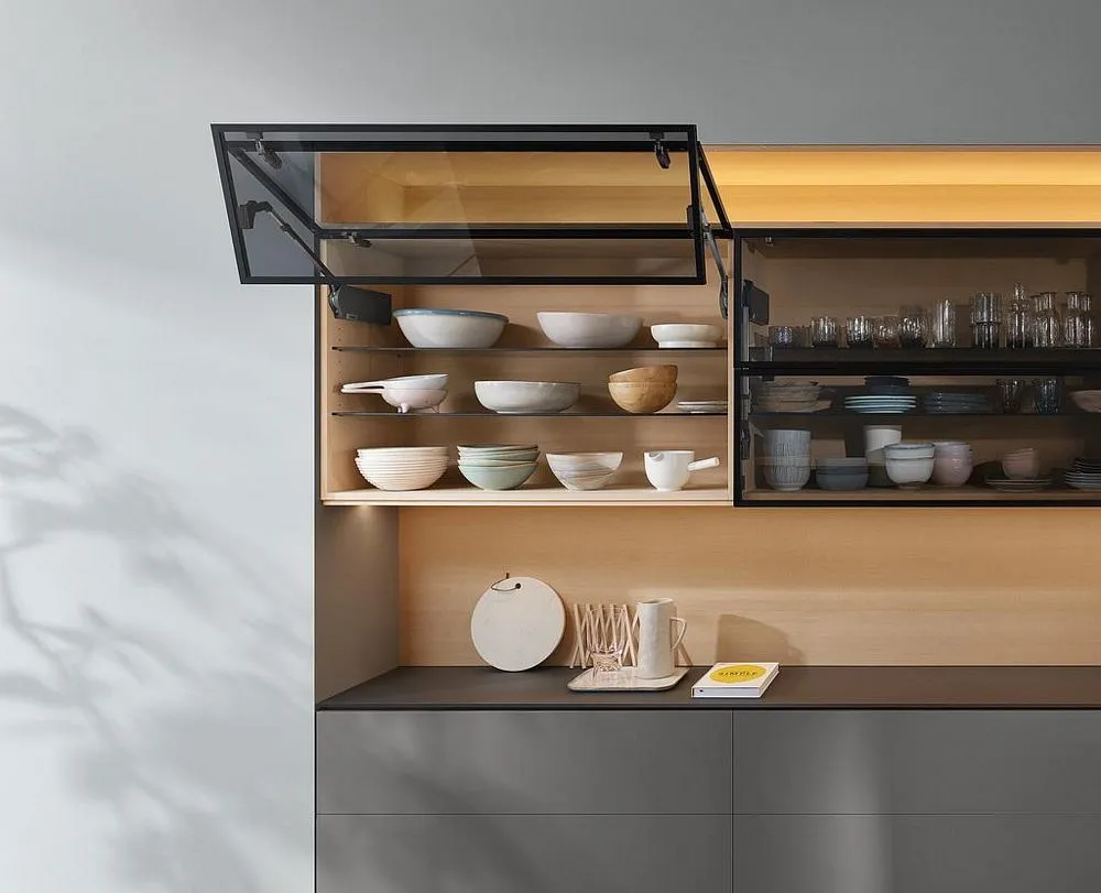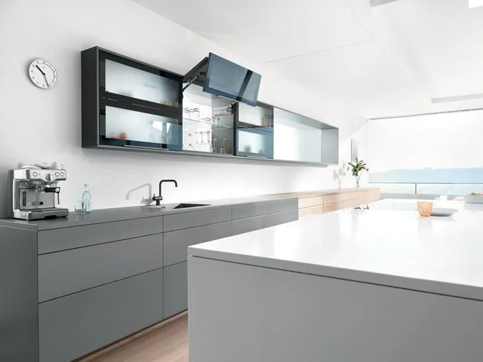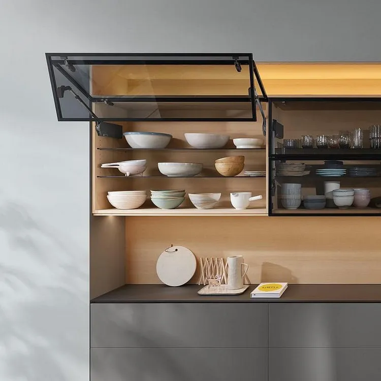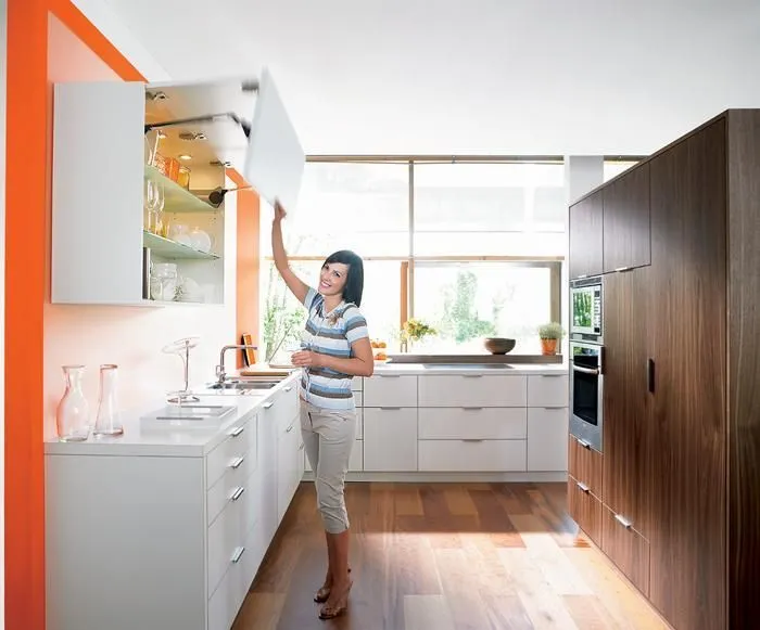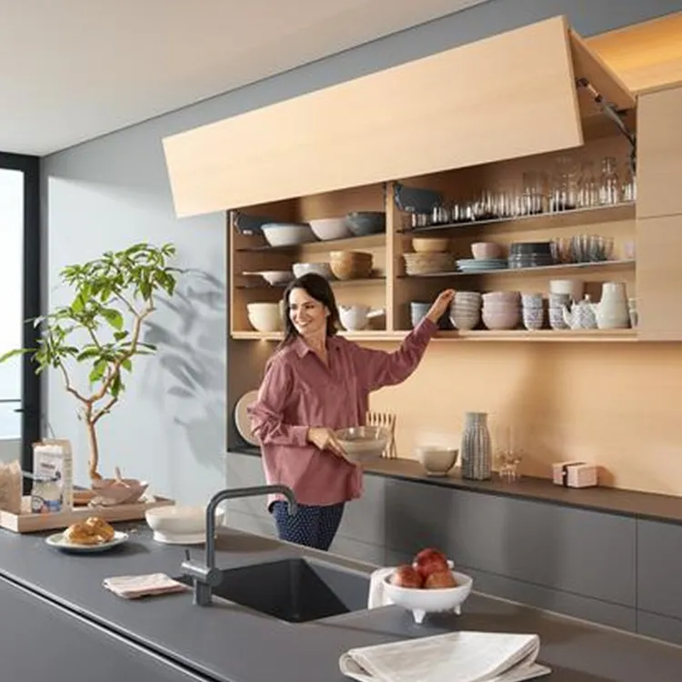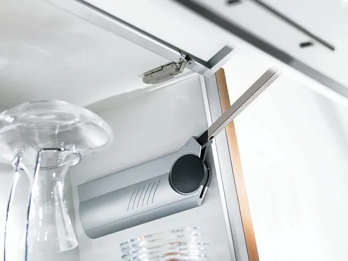 上掀折門只需微小的操作力,便可達到舒適開啟與輕柔關閉的效果。兩片折門可依設計,搭配不同材質與不同大小高度,不管是木作門,鋁框門還是其他金屬材質,blum上掀折門提供您許多設計的選擇。 另外具有防夾手與緩衝裝置,能提升廚具更多地安全與品質。