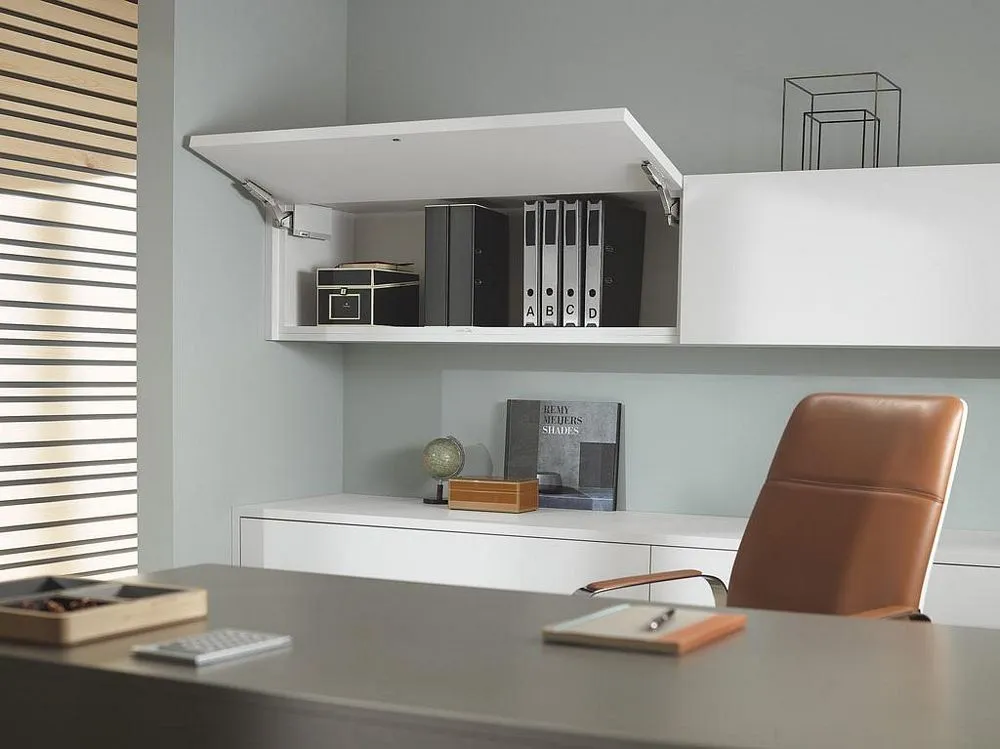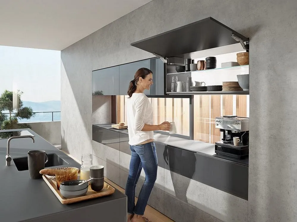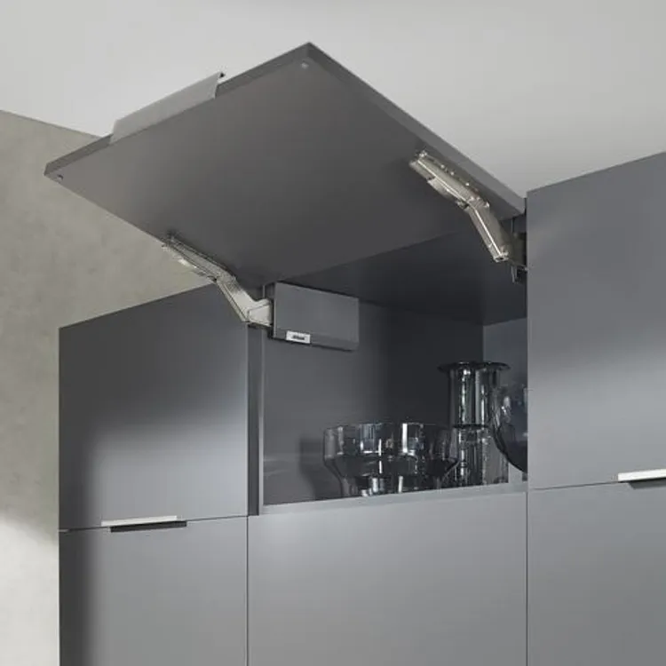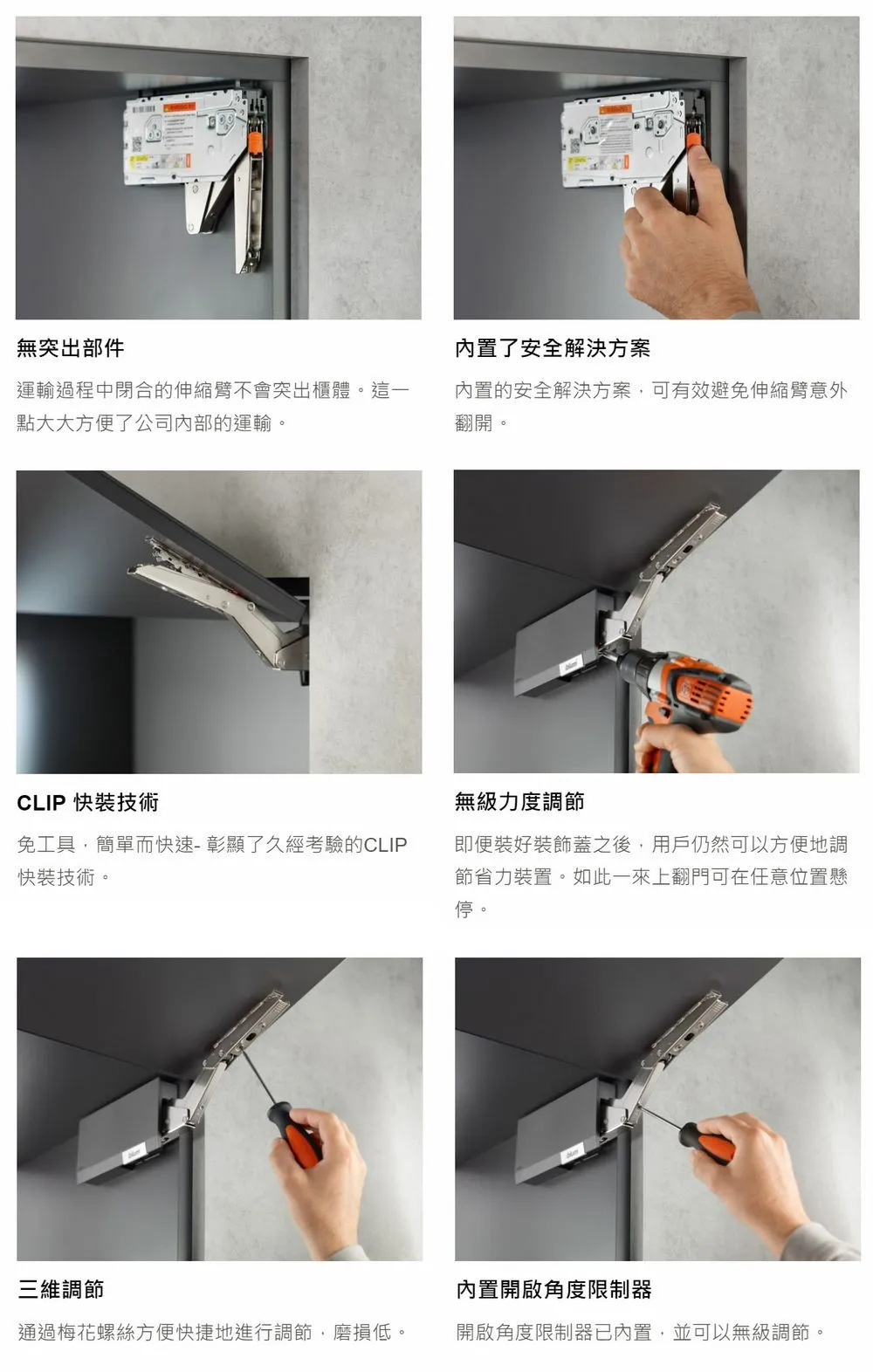 Blum AVENTOS HK 上掀門無需用力即可輕鬆開啓與關閉。隨意停掀的特點,使面板可任意停頓,讓您輕易取物。即使門片較重,關閉力度大時,也能緩衝無聲操作,無需擔心夾手及噪音問題。門板不用另外加裝西德鉸鍊,鉸鍊緩衝與撐桿作用為一體,結合您的實用與設計創意。