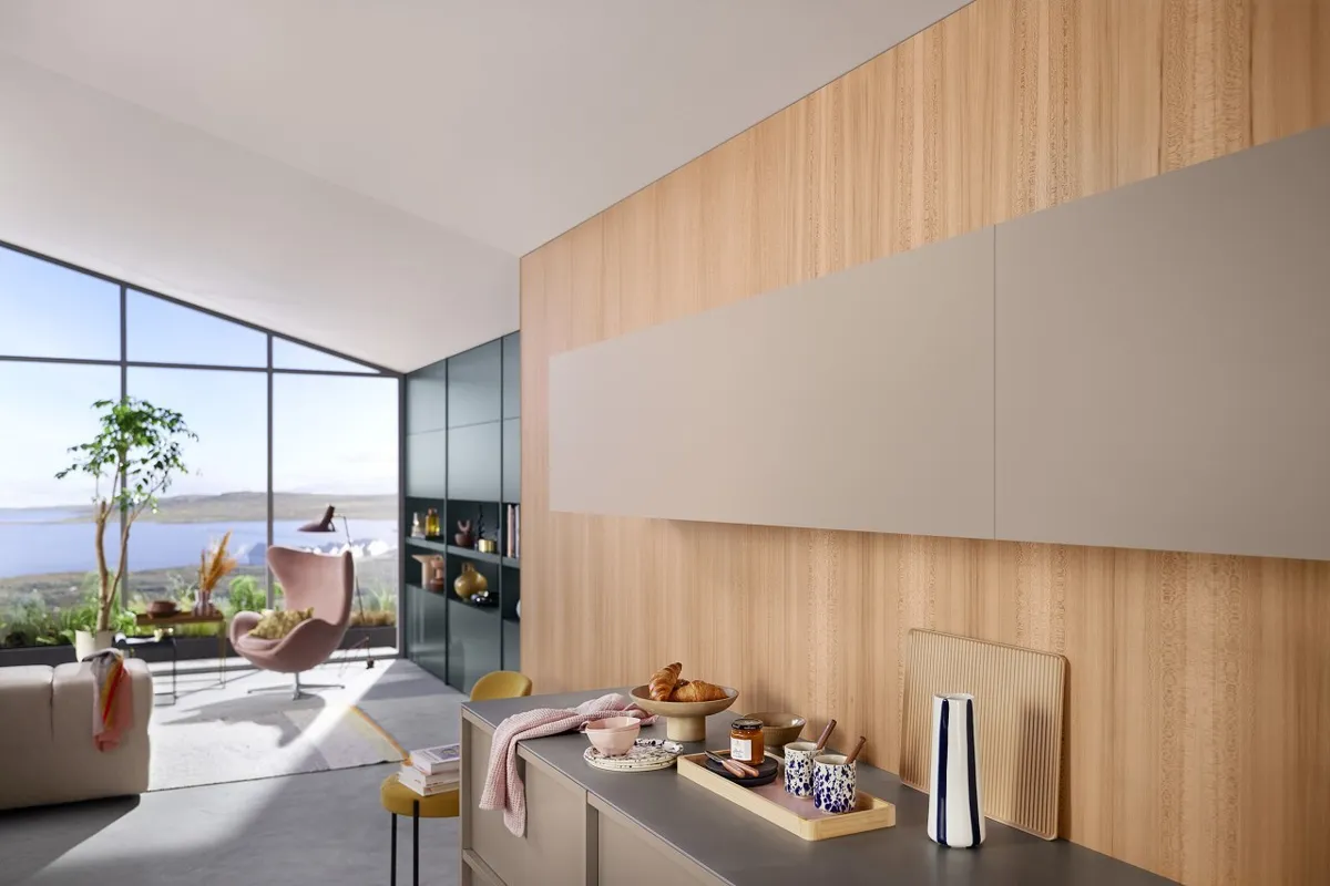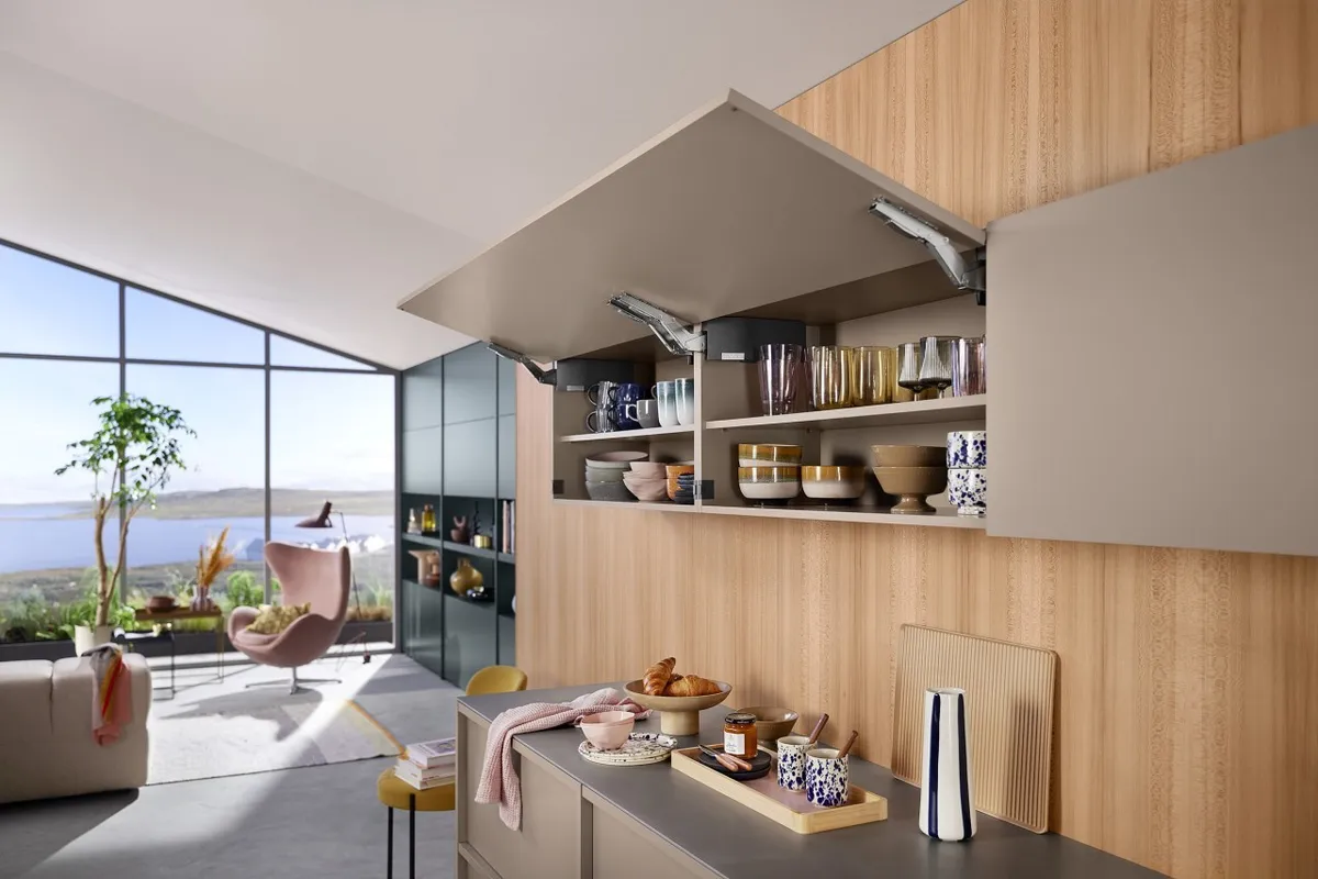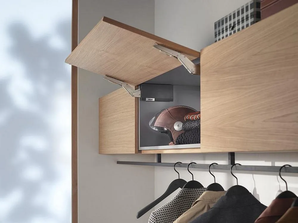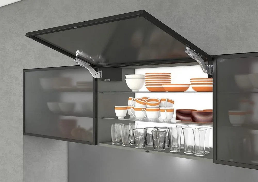 Blum AVENTOS HK 上掀門無需用力即可輕鬆開啓與關閉。隨意停掀的特點,使面板可任意停頓,讓您輕易取物。即使門片較重,關閉力度大時,也能緩衝無聲操作,無需擔心夾手及噪音問題。門板不用另外加裝西德鉸鍊,鉸鍊緩衝與撐桿作用為一體,結合您的實用與設計創意。