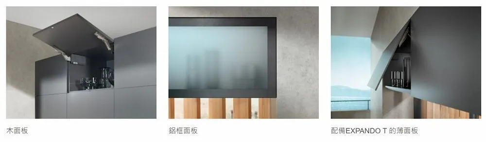 1. 適用於面板較小的上櫃,高櫃和冰箱上櫃體,可直接向上翻起單片門。