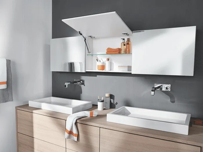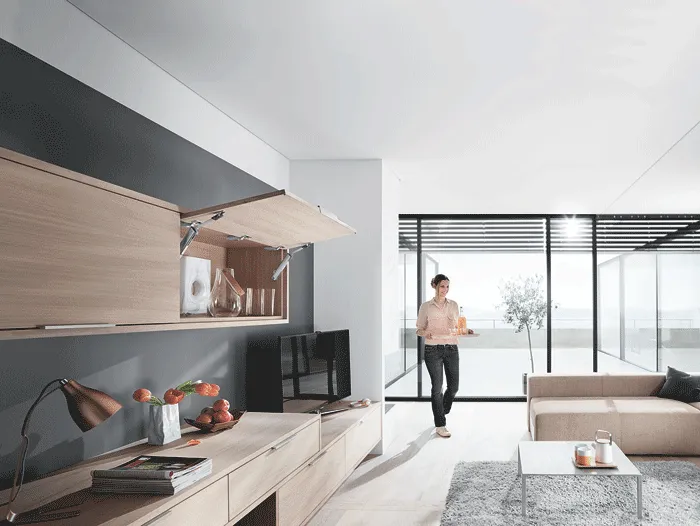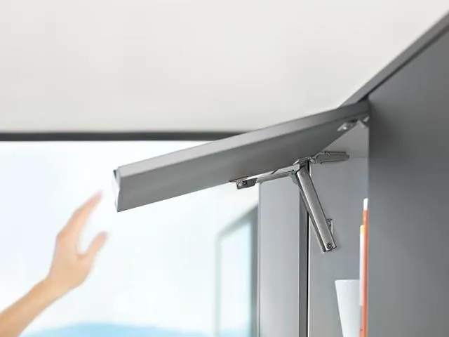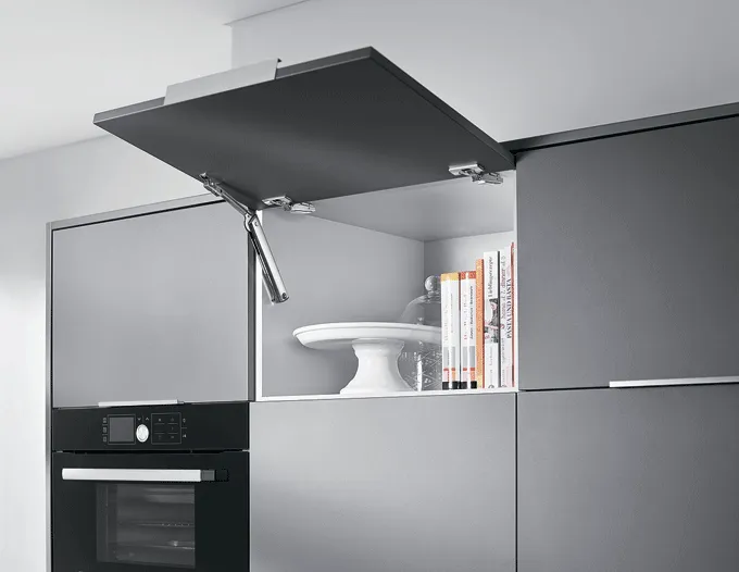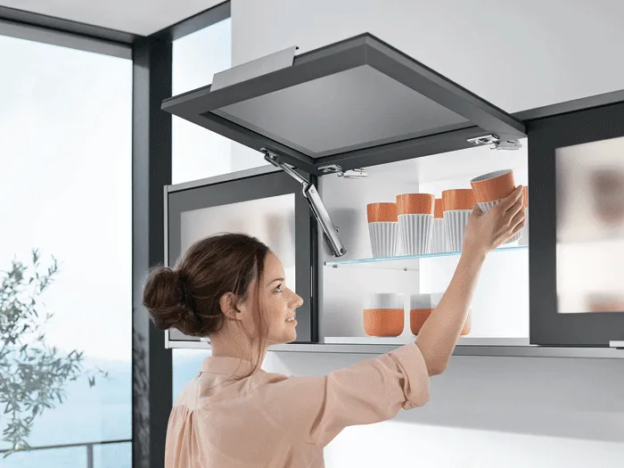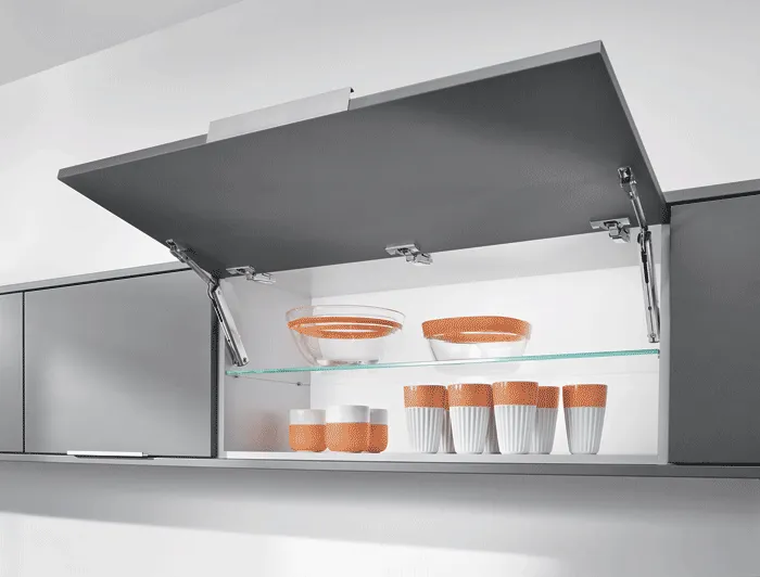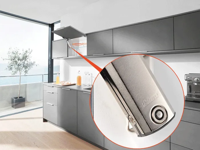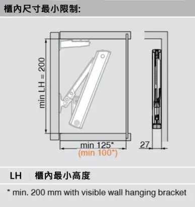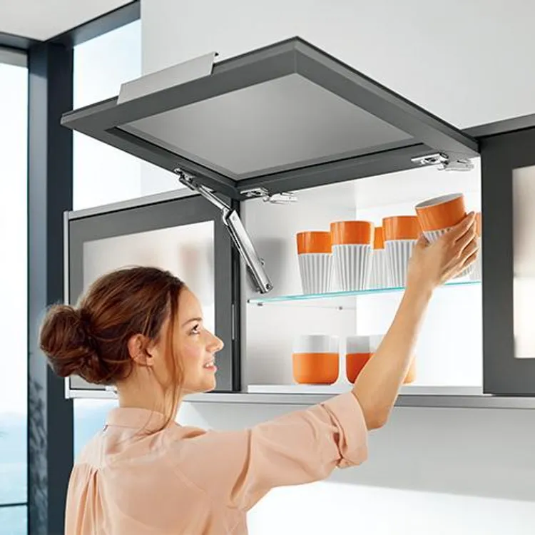 blum 迷你上掀門小怪手(HK-XS) 新款迷你撐竿,為小型高櫃和吊櫃提供了多種設計方案,例如廚房內抽油煙機上方或者浴室內水槽上方的鏡櫃。美觀耐用、不漏油、不氣衰不疲乏,使用長久。配合blum內建緩衝鉸鍊,平輕舉、卡式安裝、拆缷皆方便,可微調為隨意停。門片需事先溝通計算材質重量,方知可用1支/2支或blum其他款式。