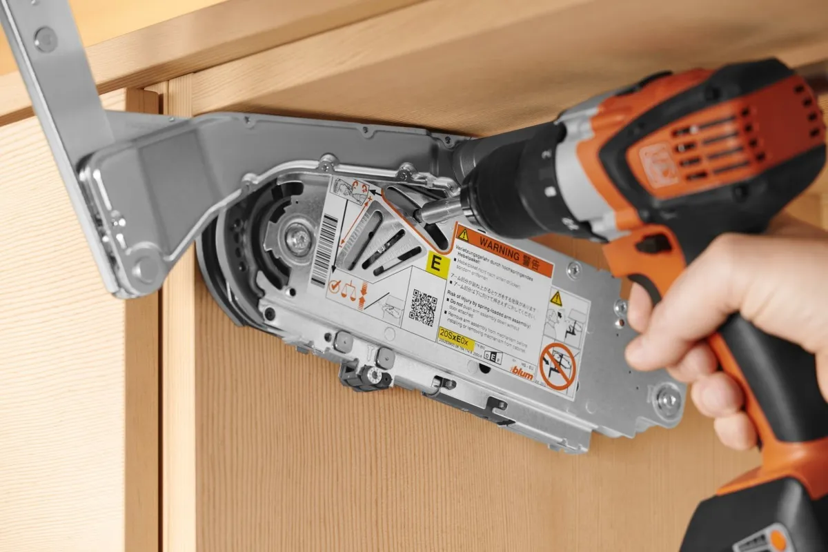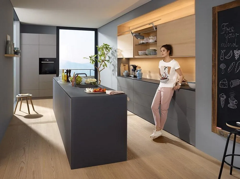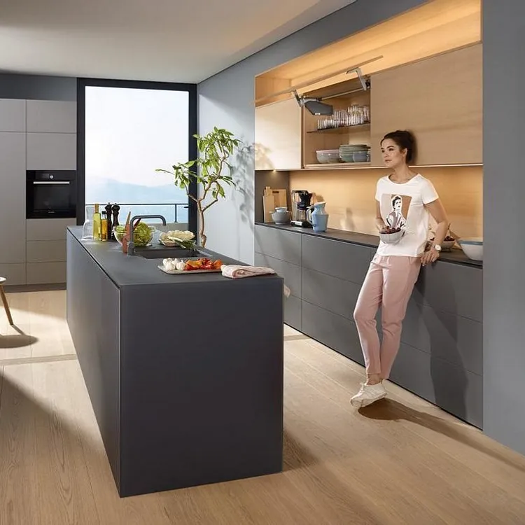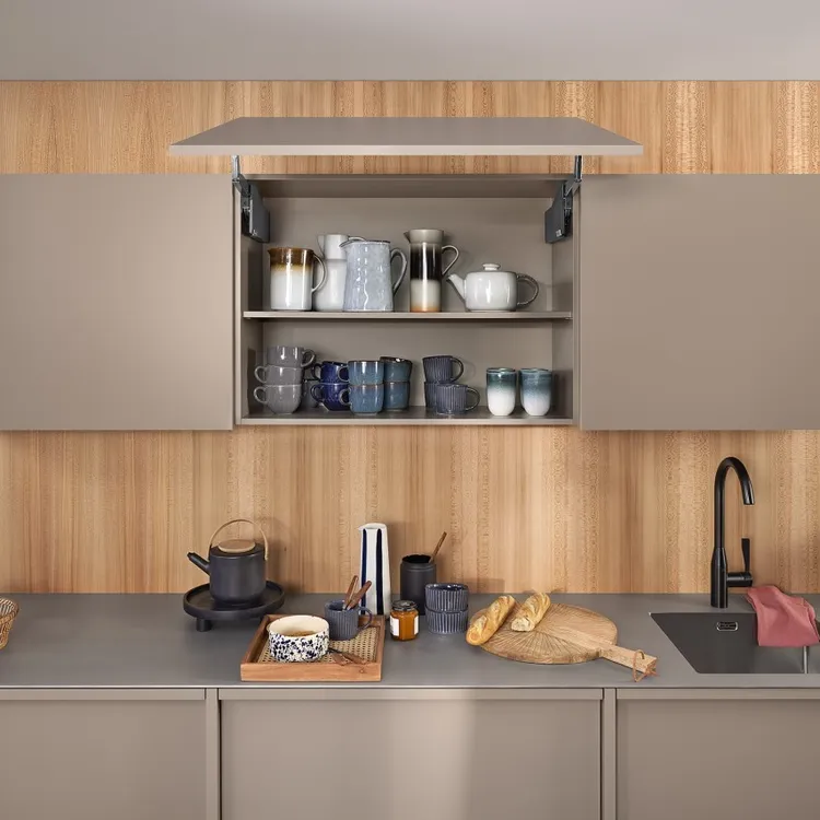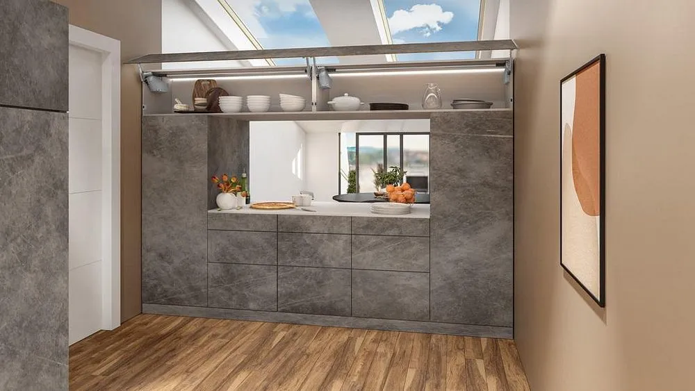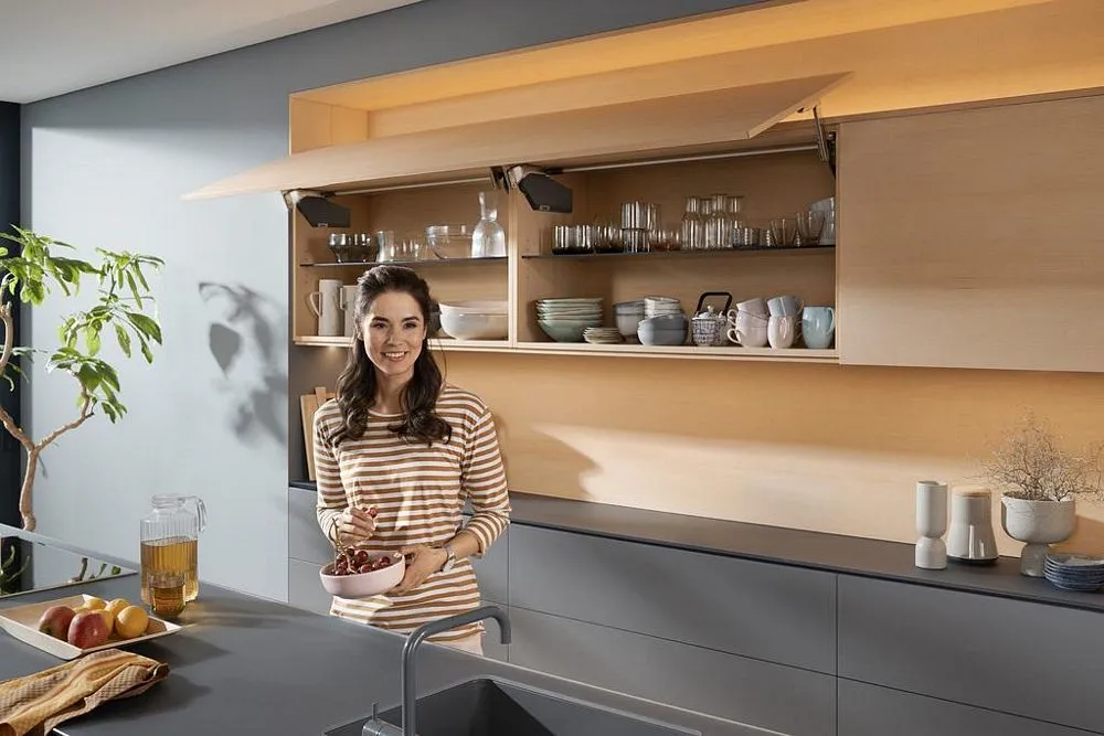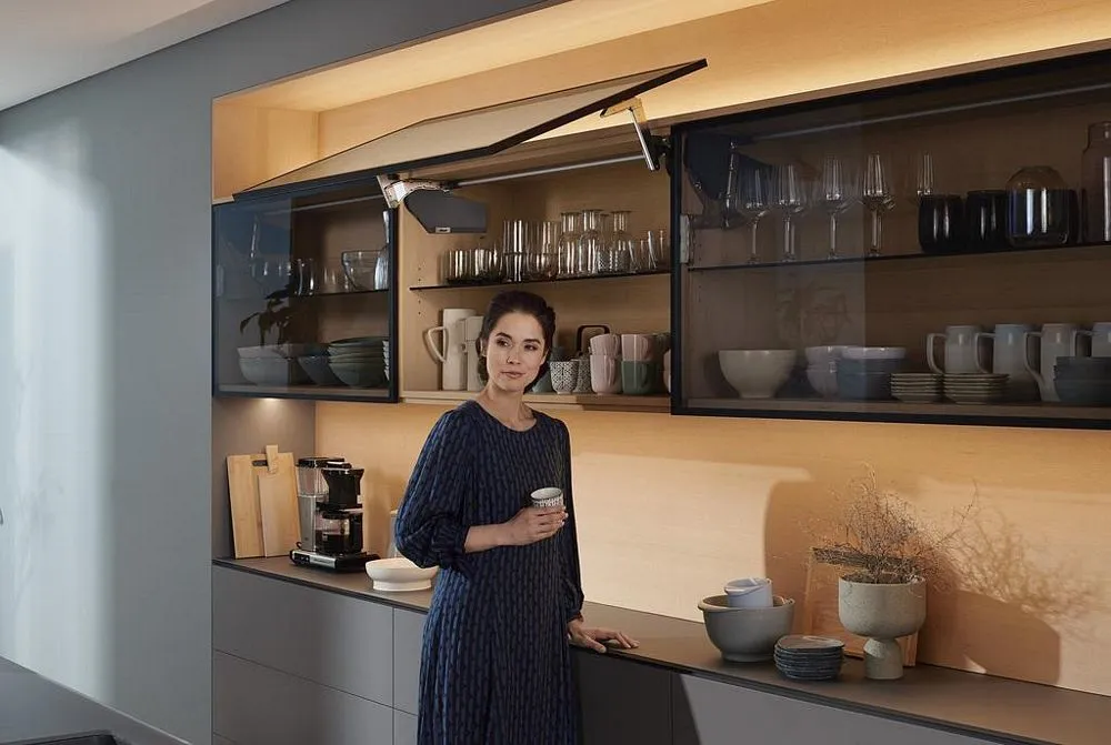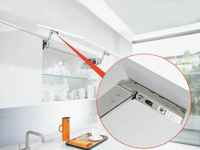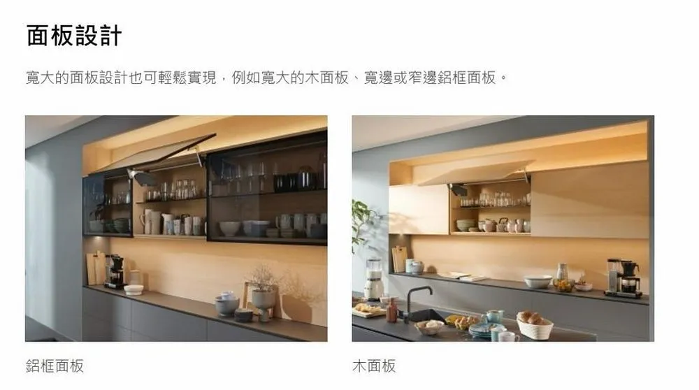 blum AVENTOS HS 後空翻是將整塊面板斜移至櫃體上方,所以適用於較大面積的單塊面板。若天花板高度不夠或是具有裝飾邊的櫃體,能讓門片輕易地翻至櫃體上方。即使是厚重的門片,仍可輕鬆開啟與關閉。隨意停掀的特點,使面板可在任一位置保持停頓,確保位於您觸手可及的高度。