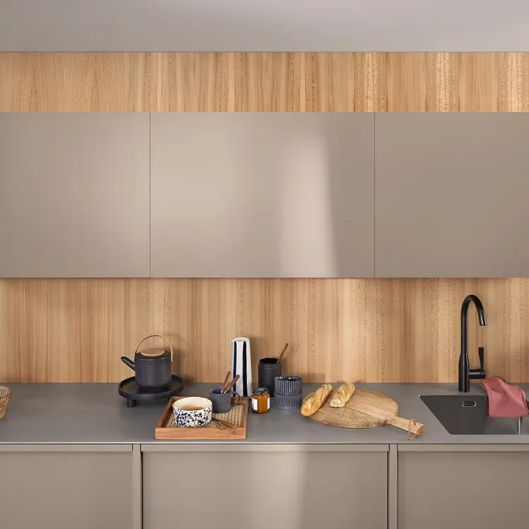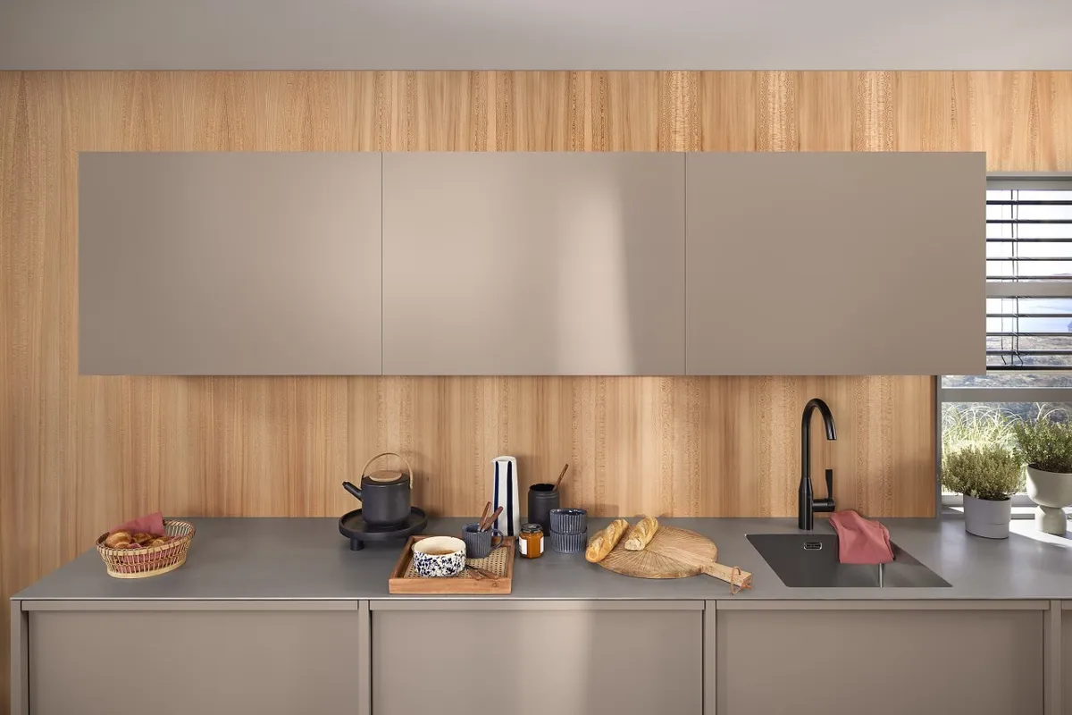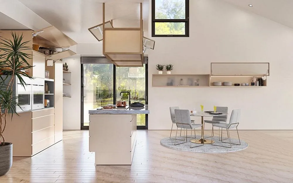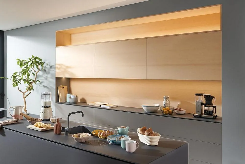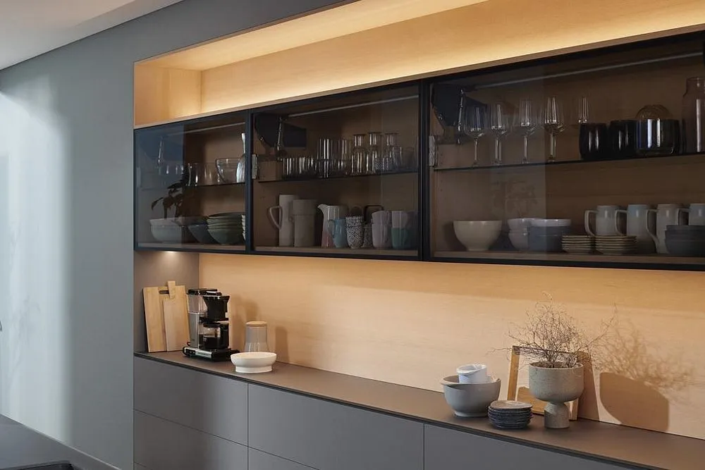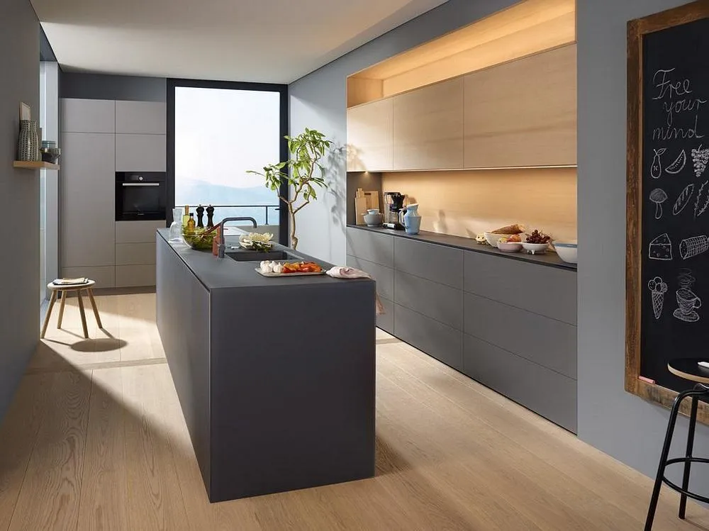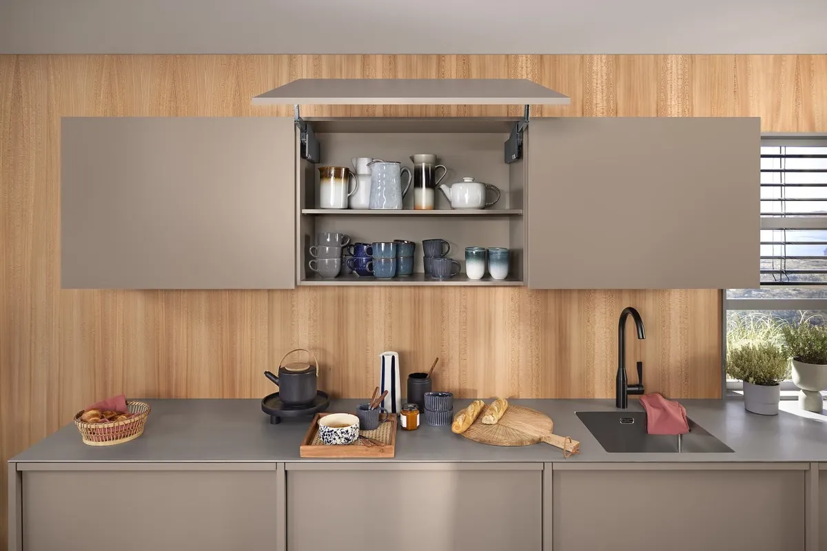 blum AVENTOS HS 後空翻是將整塊面板斜移至櫃體上方,所以適用於較大面積的單塊面板。若天花板高度不夠或是具有裝飾邊的櫃體,能讓門片輕易地翻至櫃體上方。即使是厚重的門片,仍可輕鬆開啟與關閉。隨意停掀的特點,使面板可在任一位置保持停頓,確保位於您觸手可及的高度。