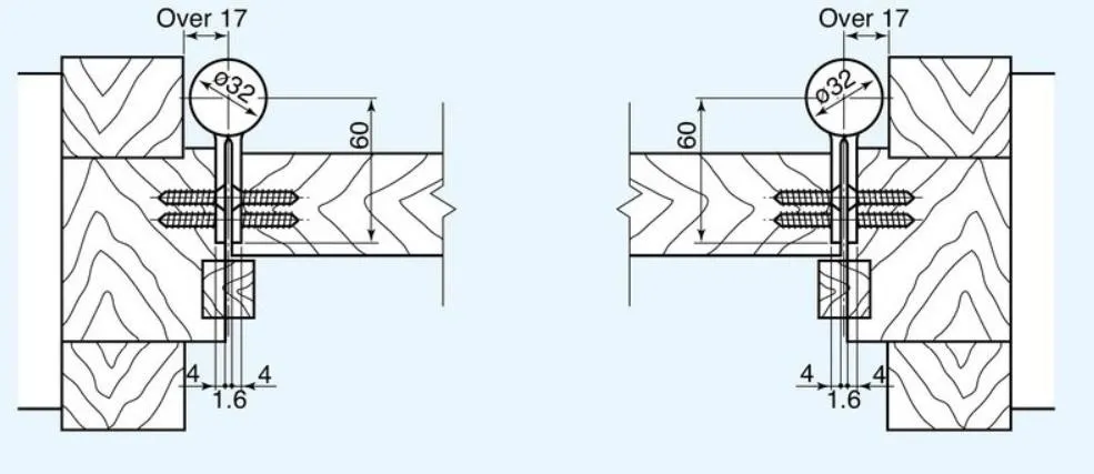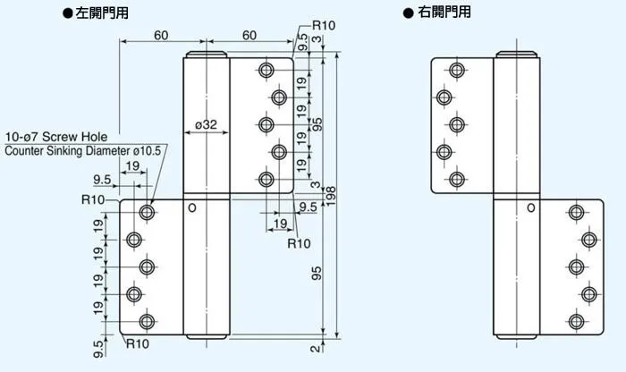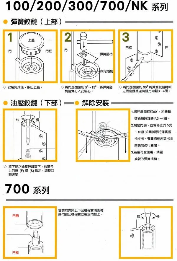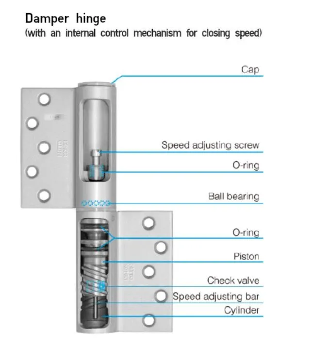 上下兩片鉸鏈為一組, 上部為回歸啟動之彈簧鉸鏈, 下部為控制回歸速度之油壓鉸鏈