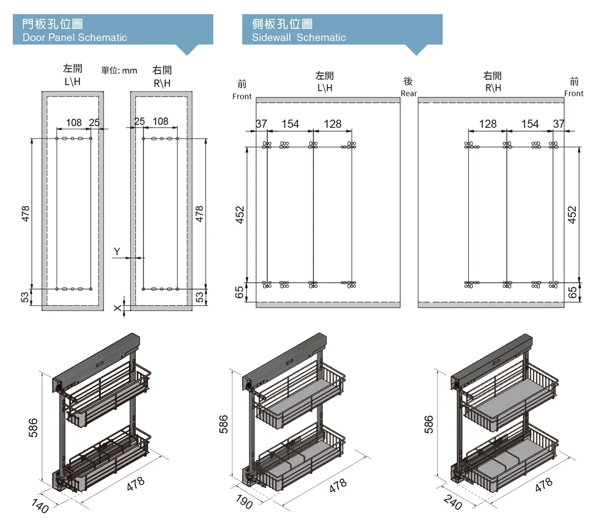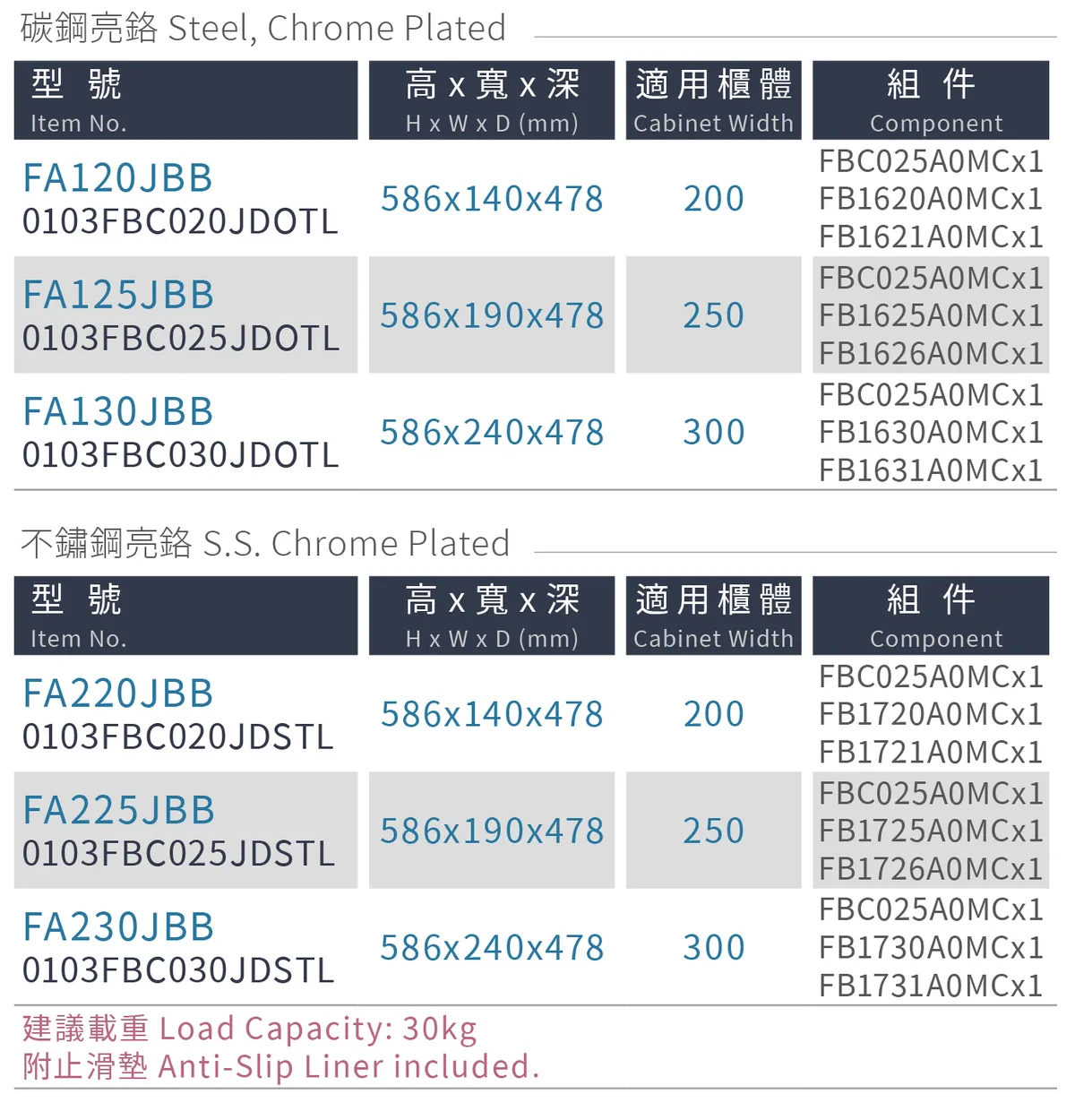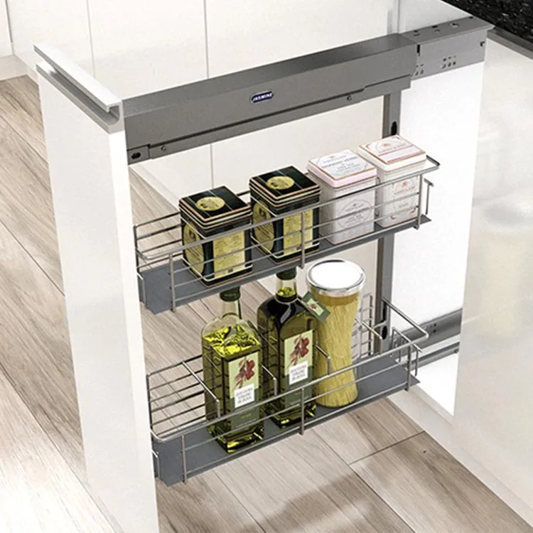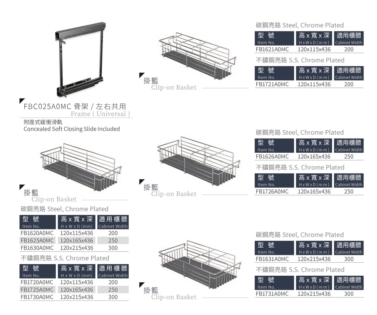 產品規格: -座式緩衝滑軌/附止滑墊 -碳鋼亮鉻 / 不鏽鋼亮鉻 -200 / 250 / 300 櫃體適用 產品介紹: 多半用於收納調味盒及瓶罐器具, 通常設計在爐具下方左右兩側使用, 創造小空間大容量的格局