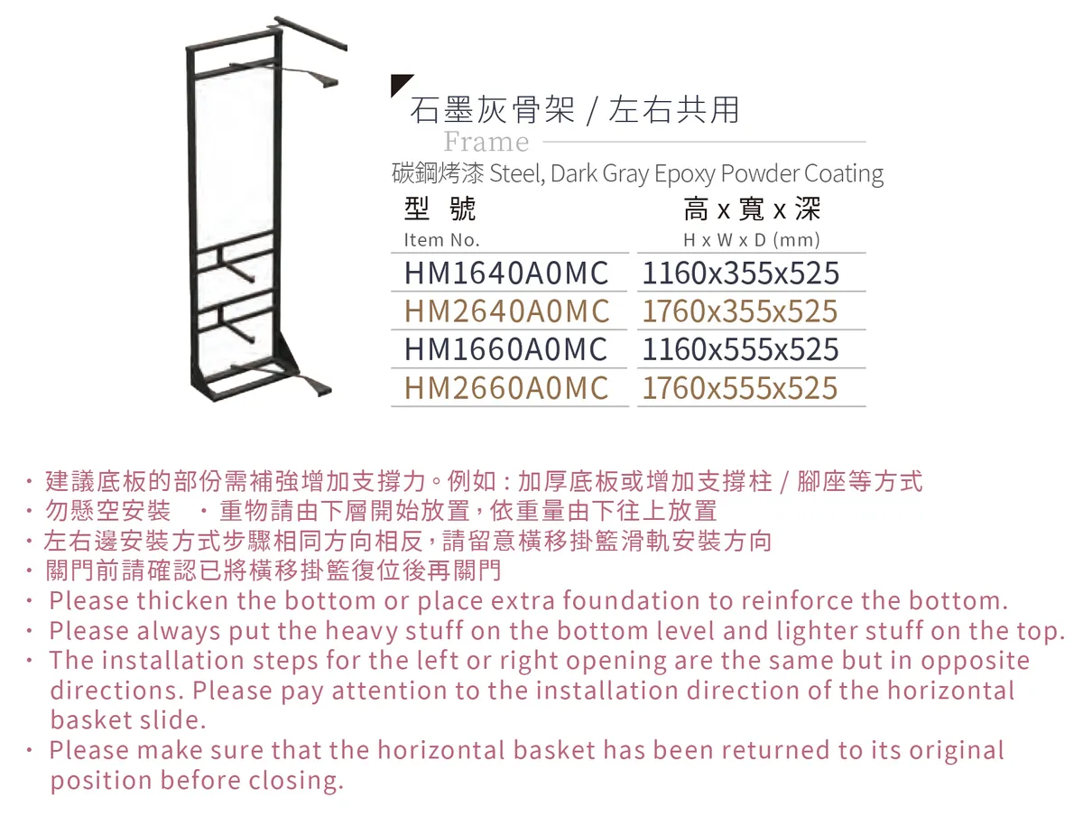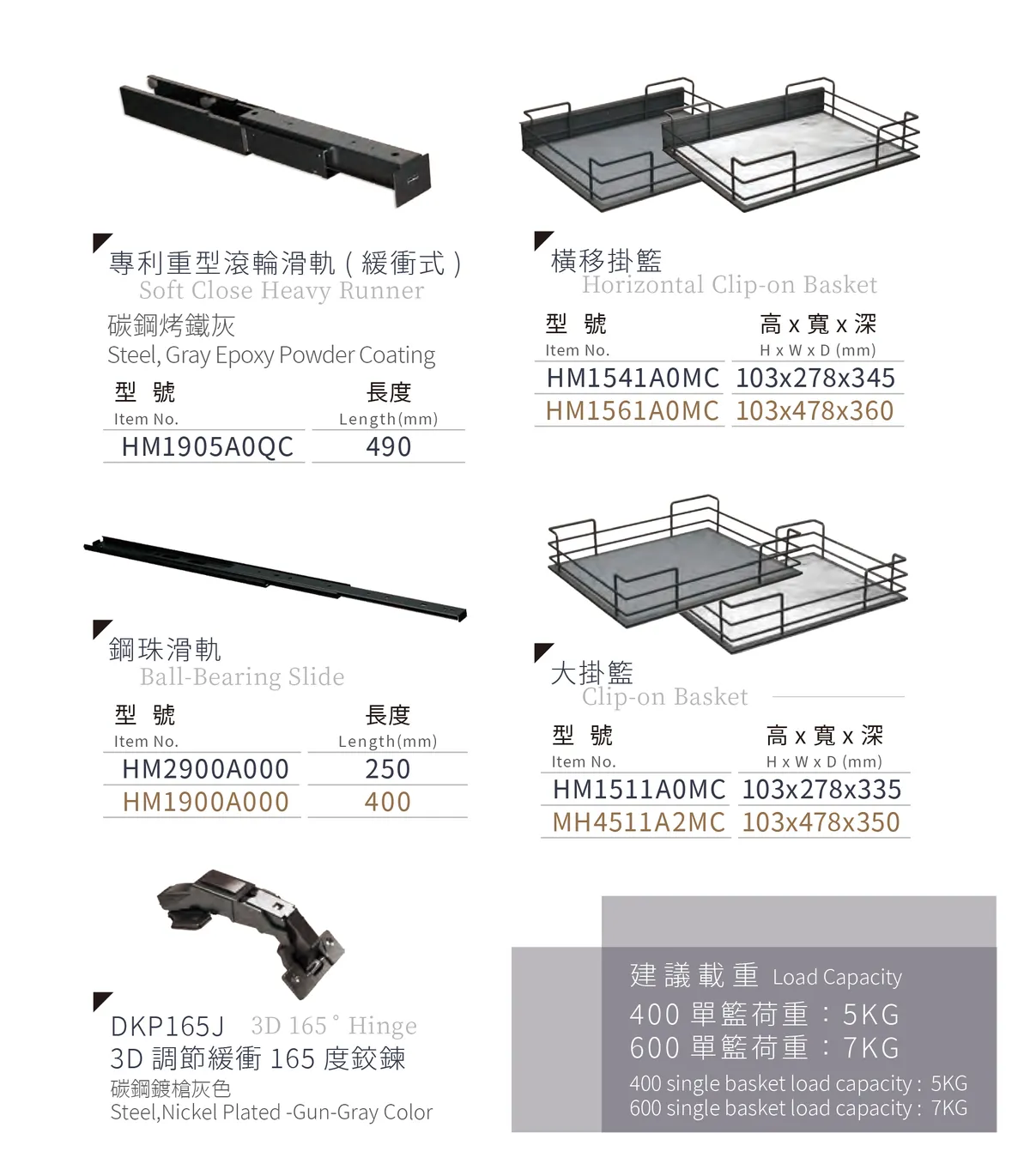 建議載重 : 400單籃荷重:5 k g / 600單籃荷重:7 k g