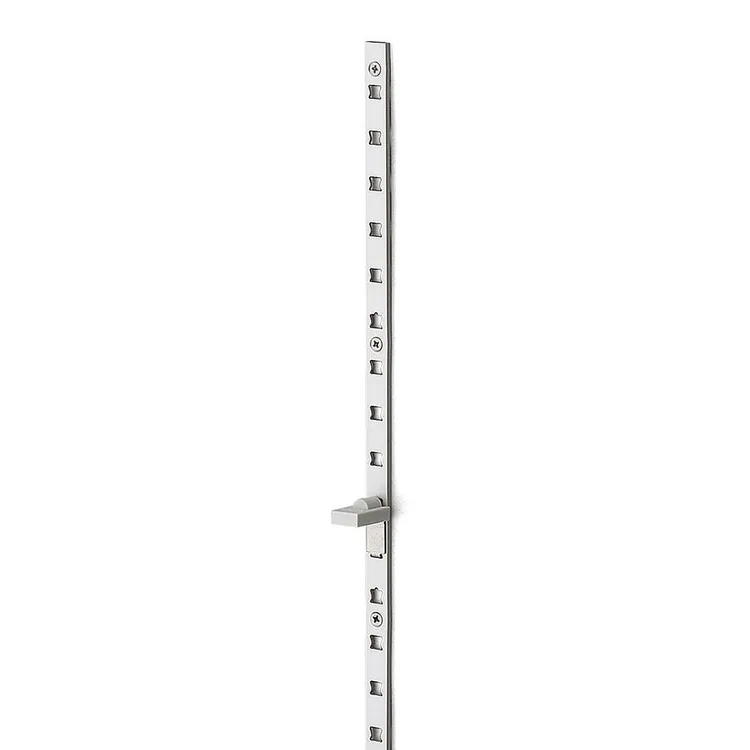 日本進口外鎖式鋁製隔板條-鋁色材質:鋁合金 ABS顏色:鋁色/黑色因為它是鋁合金製成的,可在擱板架安裝於木製家具時,或多個擱板架綑在一起的狀態下進行切割加工。厚度僅有3mm,即使表面安裝也幾乎看不到與擱板之間的間隙。螺紋孔的數量增加至舊款的1.8倍(與本公司產品相比),解決了切割時螺孔不足以及側板芯位置的平衡問題。採用新設計的擱板知架形狀,發生意外接觸時擱板知架也不會脫落。 使用範例 安裝範例 實品拍攝
