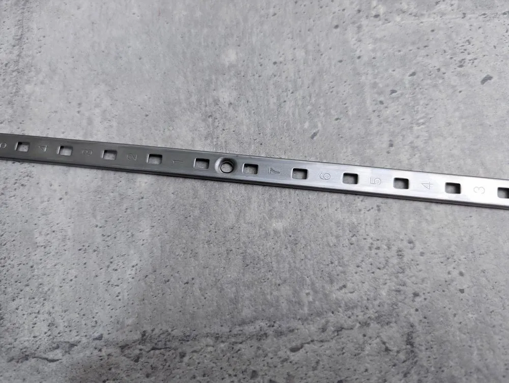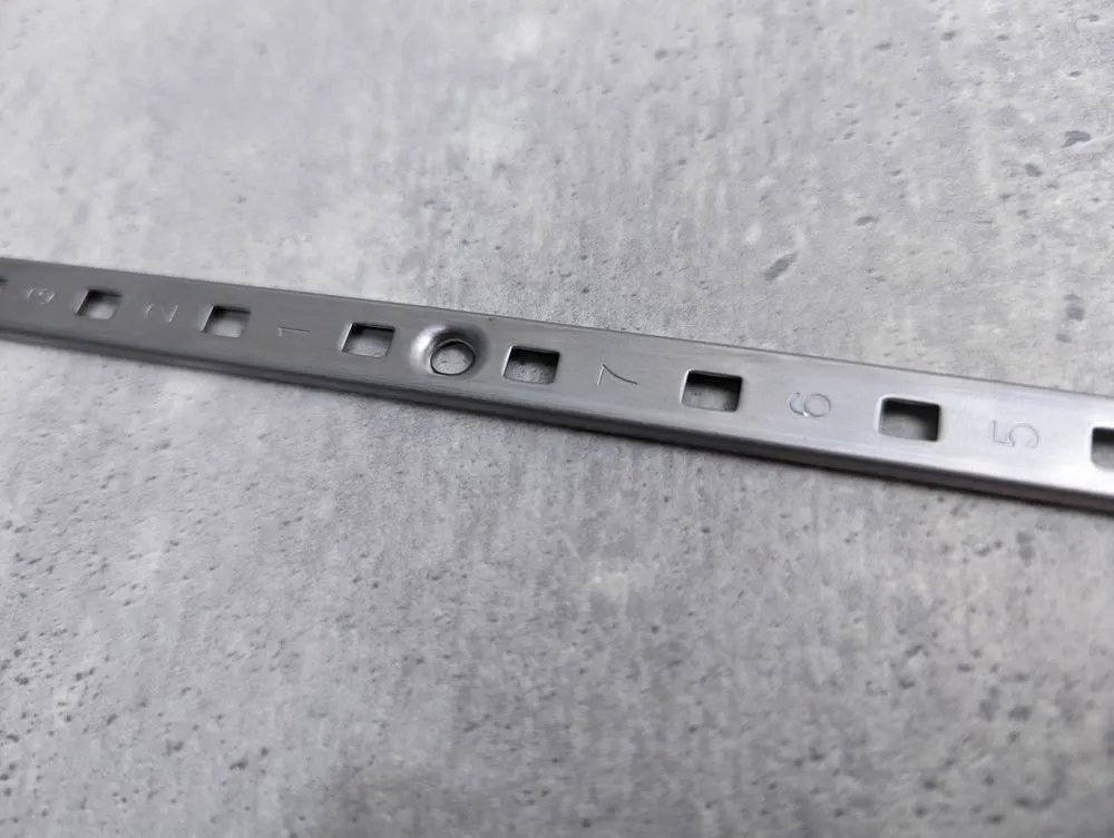 日本進口外鎖式不鏽鋼製隔板條材質:不鏽鋼厚度僅有3mm,即使表面安裝也幾乎看不到與擱板之間的間隙。可以以20毫米的間距進行調整,表面印有編號,使高度調整變得容易許多。配件請使用不鏽鋼專用配件-SPE-FB20S、SPE-FC20 安裝範例 實品拍攝