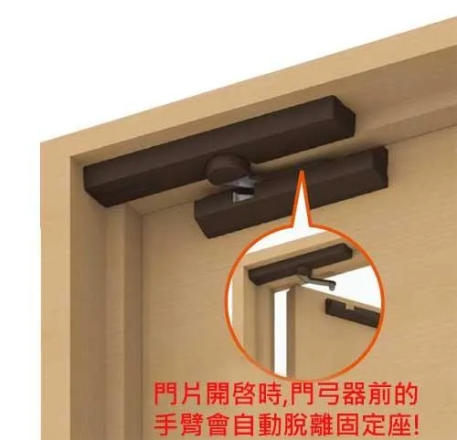 此產品為日本進口室內門專用的緩衝門弓器五金。門片關閉小於15度時,即有緩衝效果。