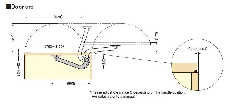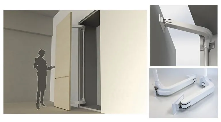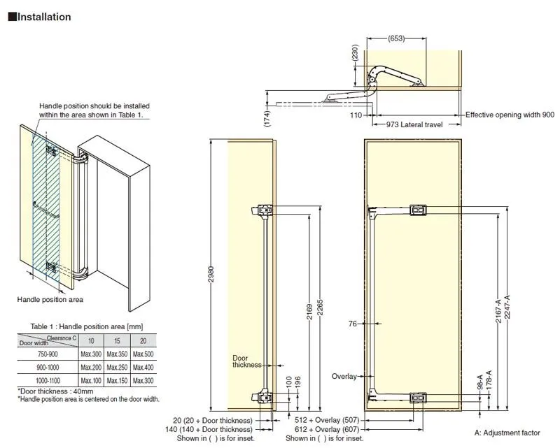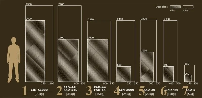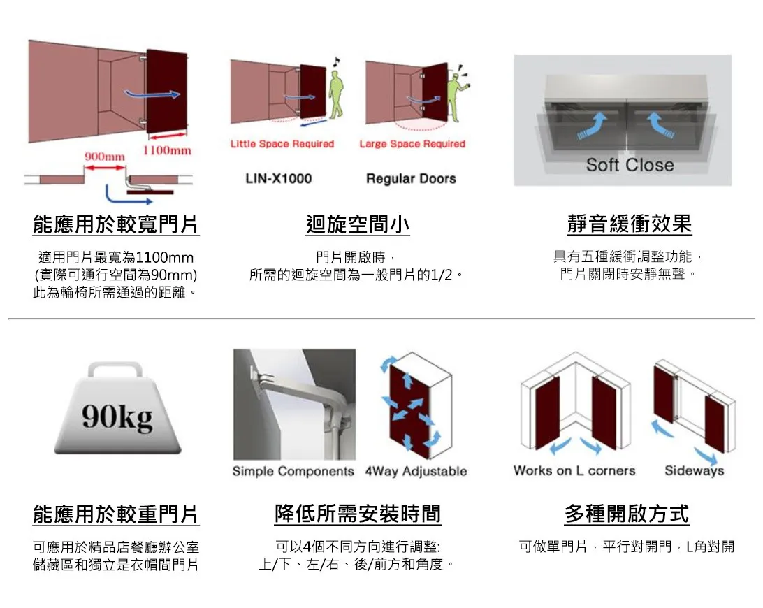 日本進口極重型巴士門(Lin-X1000)門片載重最重可達90kg,適用門寬為750-1100mm,門高為2400-2980mm。 手臂撐桿內建緩 衝氣壓棒,門片關閉時,安靜無聲有緩衝效果。門片迴旋距離較小,且適用載重及門寬較寬,特別適合 應用於無障礙空間、通道門、一般大門片櫥櫃門或商業空間。 適用門片尺寸圖 應用範例 相關影片