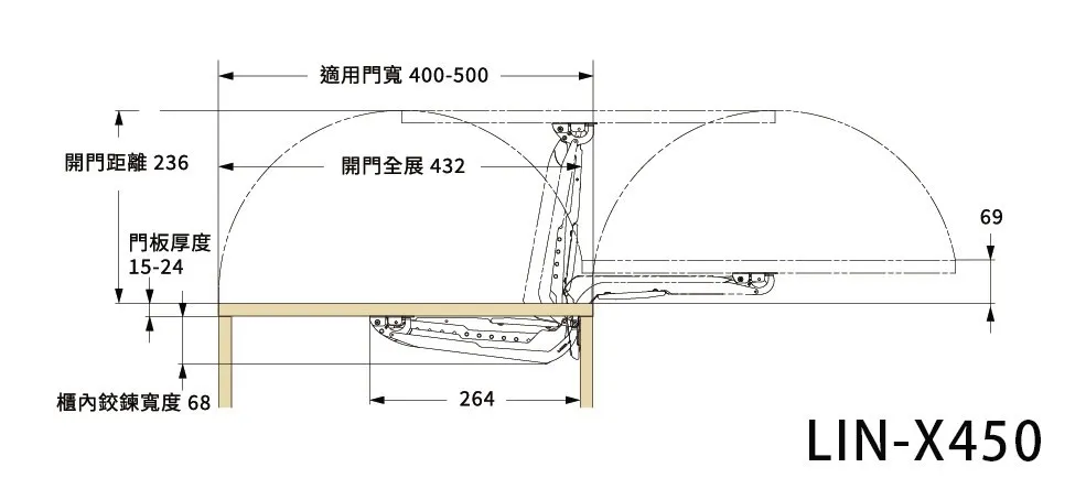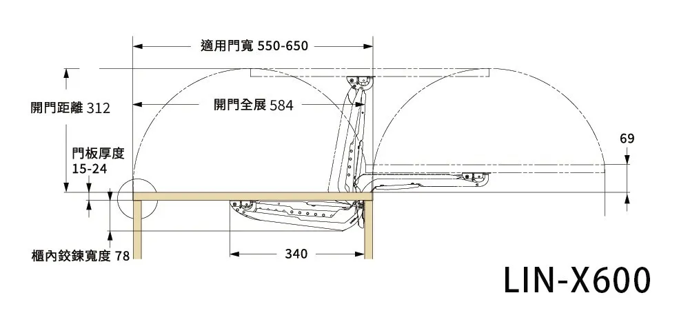 產品說明:1. LIN-X450 門片寬度: 400~500mm。門片高度: 600~900mm。門片厚度: 15~24mm。LIN450安裝說明書▼ 2. LIN-X600 門片寬度: 550~650mm。門片高度: 600~900mm。門片厚度: 15~24mm。LIN-X600安裝說明書▼ LIN-X600應用範例 ▼ 相關影片
