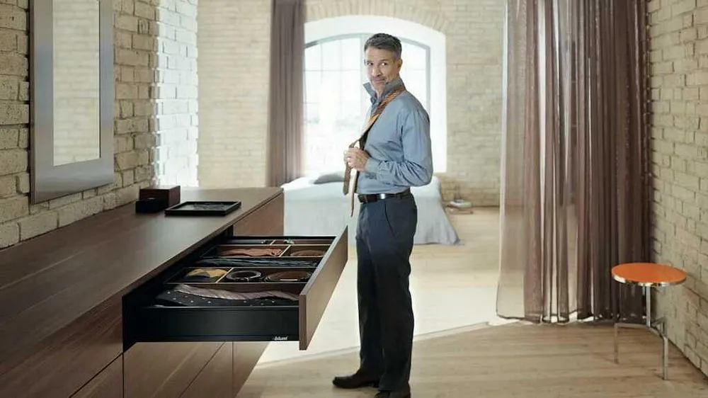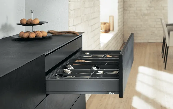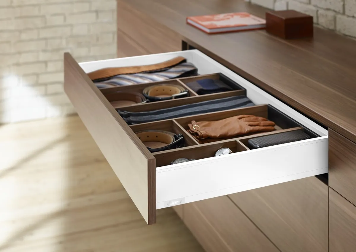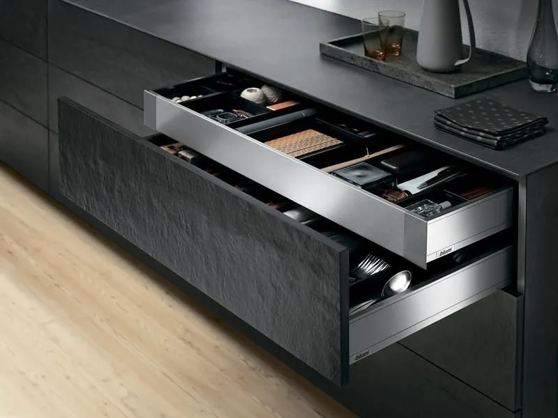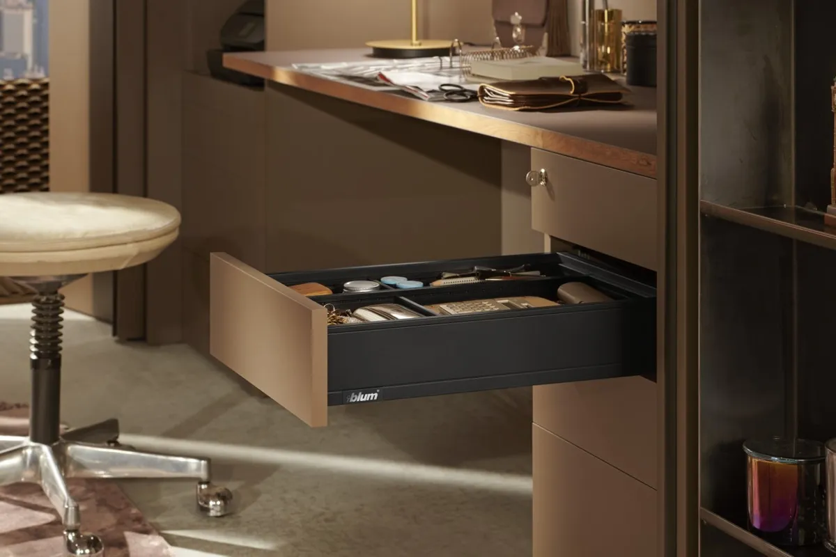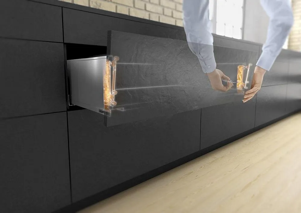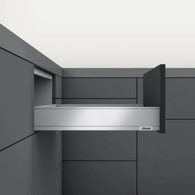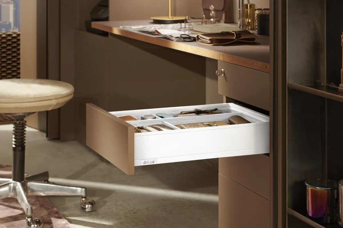 作為一種設計元素,高面板越來越重要。為了迎合這種設計趨勢,LEGRABOX 超薄麗拉金屬抽屜系列,新的面板固定件,確保抽屜開合過程中的穩定性。