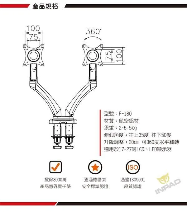 符合VESA規格7.5 x 7.5 cm - 10×10cm(附輔助片)。