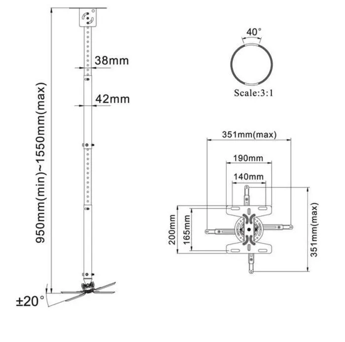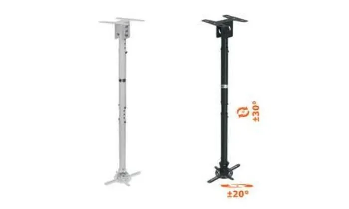 產品說明: 適用任何廠牌投影機。 可左右旋轉30°,俯仰往上20°往下20°。 投影機與天花板距離53~83cm。 承重: 13.6kg。 材質: 精密無縫鋼管,SPCC高強度鋼版 顏色: 白色。 本產品設有出線孔。 ※本產品通過德國GS安全標準認證。 ※本公司產品通過ISO9001品質認證。