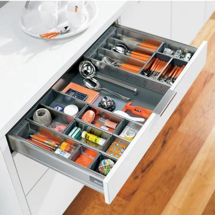 ORGA-LINE 鋁抽專用內分隔系列中的不鏽鋼組合式刀叉盤,讓物品各就各位,方便您隨取隨用。所有物品一目了然且收納穩當,刀叉盤可輕鬆從抽屜內取出使用,而且可以放在洗碗機清洗。