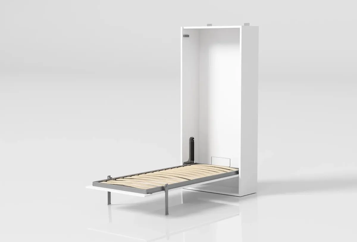 義大利原裝進口正掀單人床五金(含排骨床架及床腳),能垂直隱藏式收起於櫃體中,下降時,具有緩衝功能。掀床收起時,床腳能隱藏於櫃體中,掀床下降時,床腳具有自動定位功能。