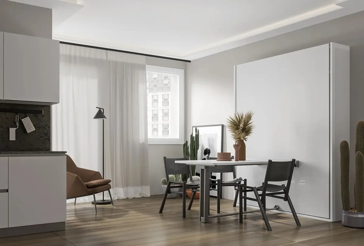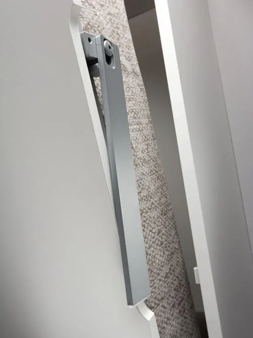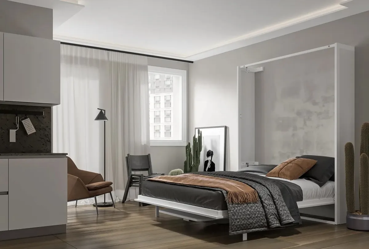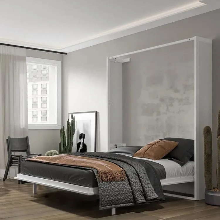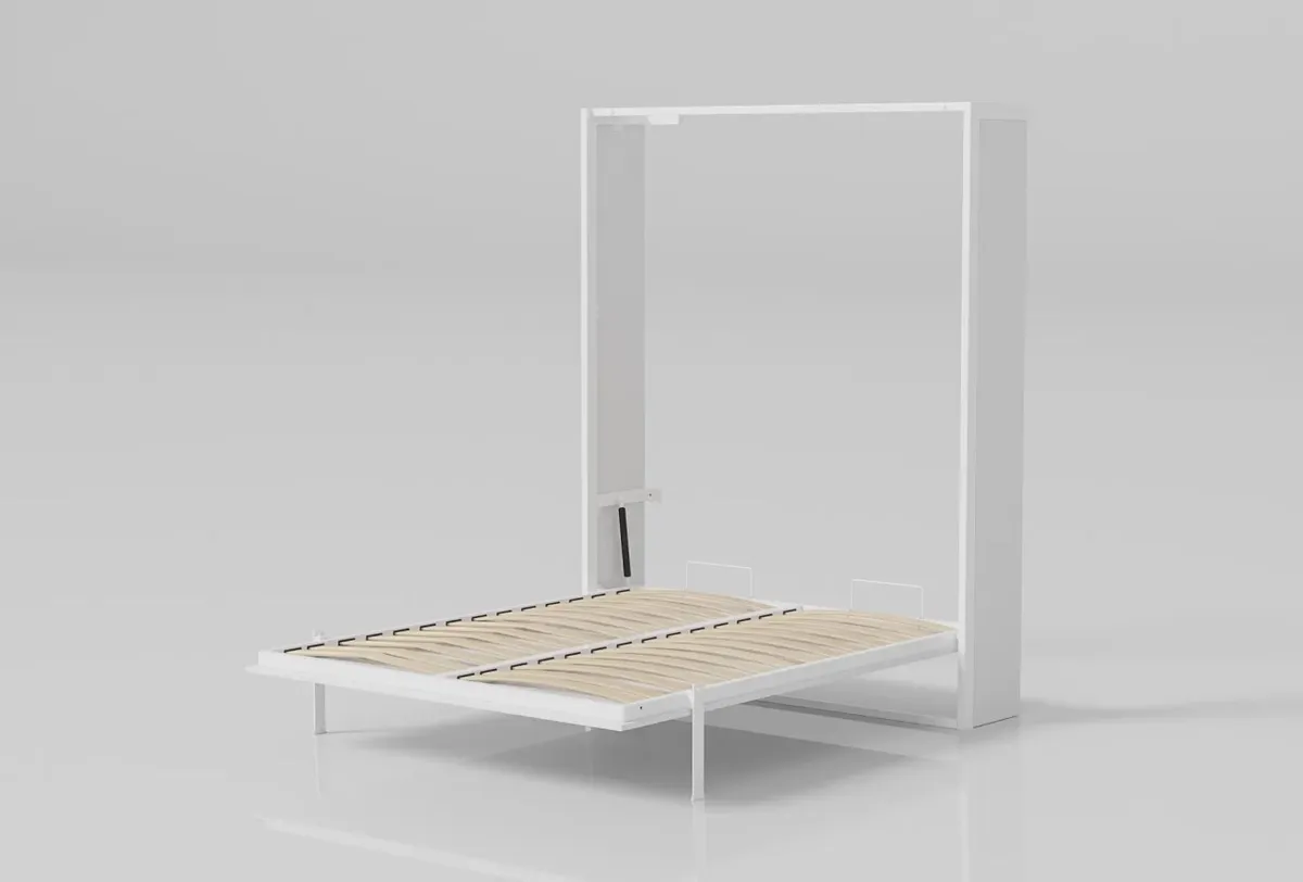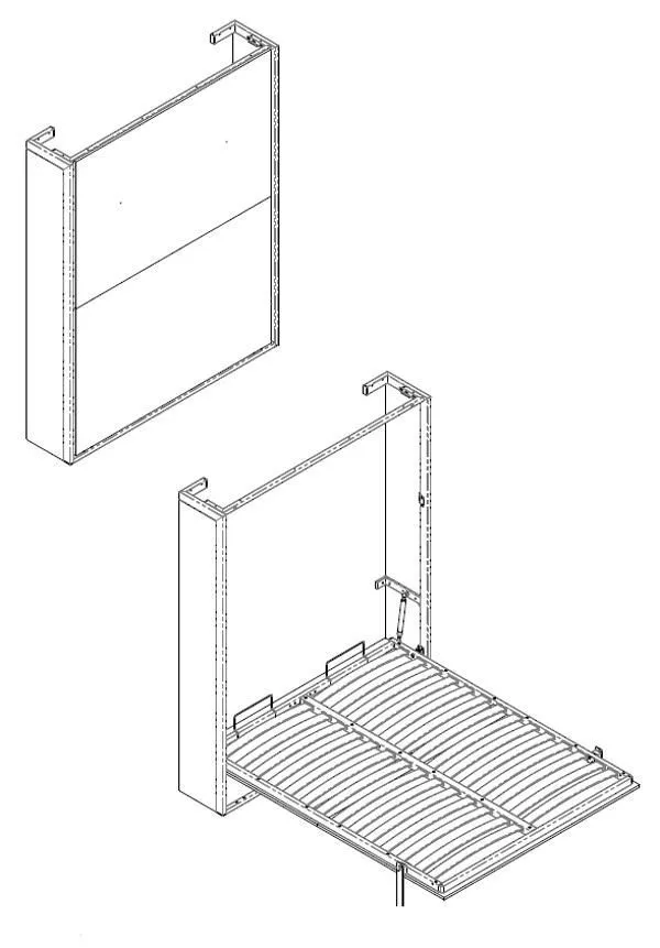 義大利原裝進口框架型正掀雙人床五金(含排骨床架及床腳),是簡單的wallbed system,附有鋼材結構櫃框,只需將側板及面板組合固定,而無需製造完整的機櫃,安裝簡單,省時省料。並有一般掀床功能,如: 收起時能垂直隱藏式收藏於櫃體中,下降時,具有安全緩衝功能。床體收起時,床腳能同步隱藏於櫃體中,掀床下降時,床腳會同步下降且具有自動定位功能。