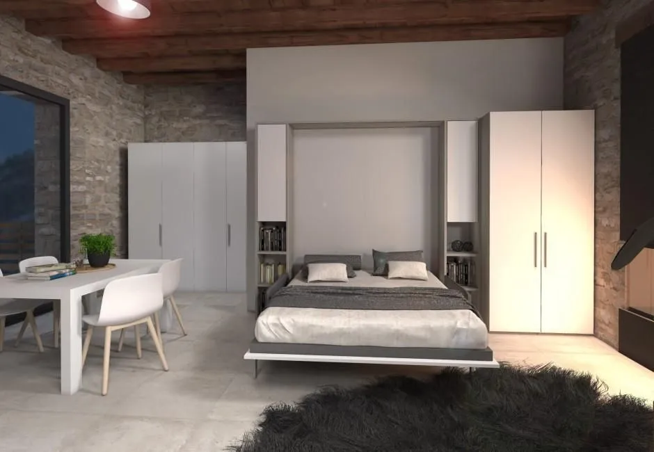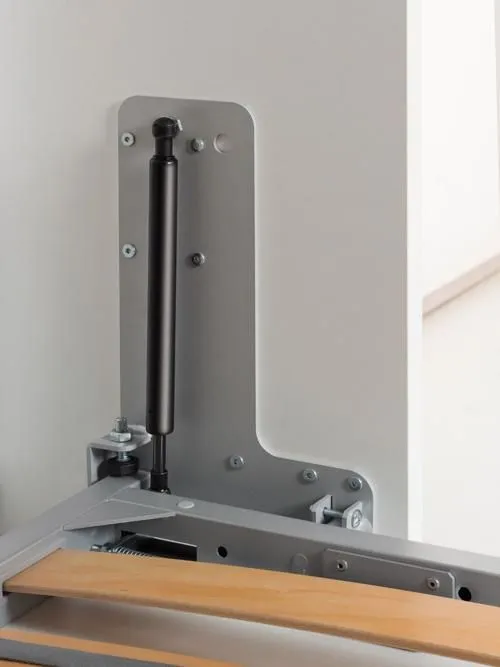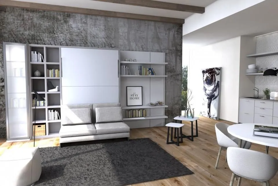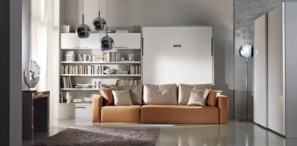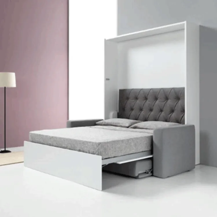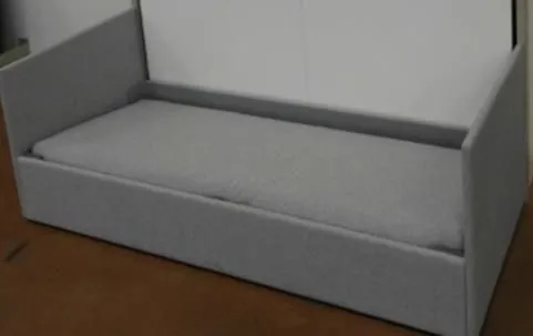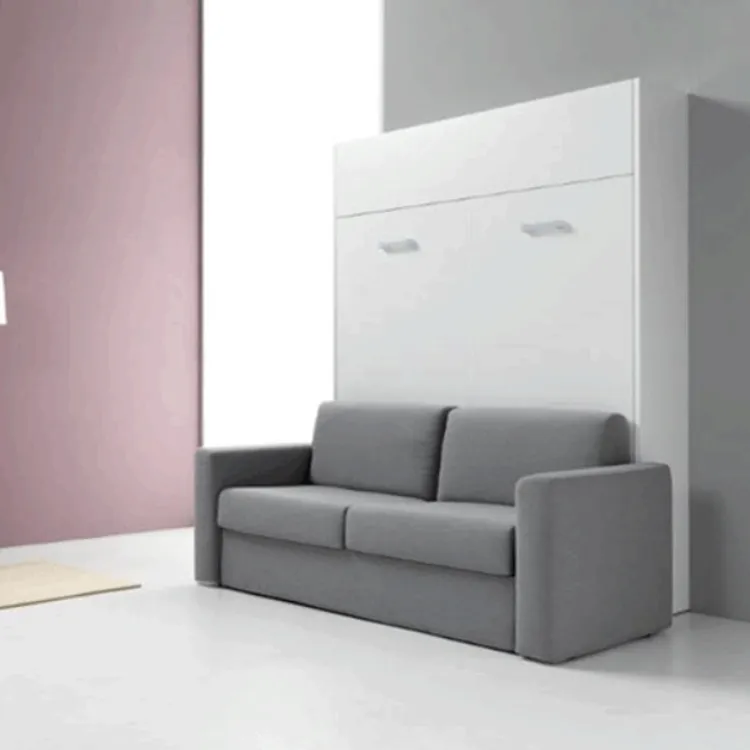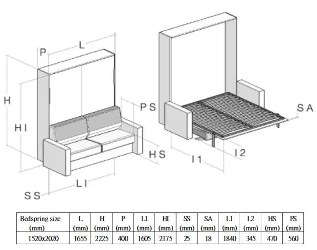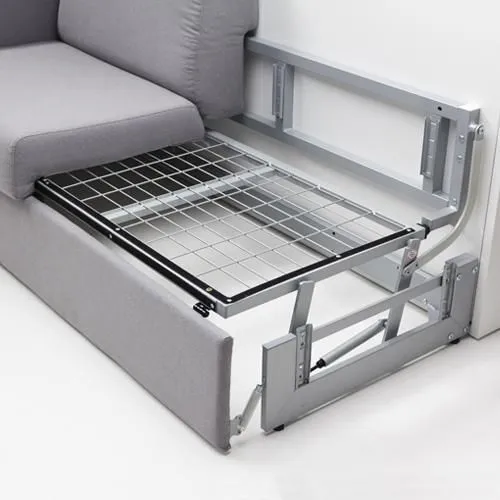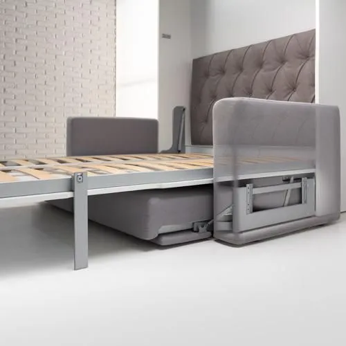 歐洲原裝進口沙發床五金,是一款多功能且實用的床組,配有下降緩衝氣壓撐桿,使掀床能平穩地下降並避免壓傷,操作輕鬆省力。掀床不用時,可上升垂直收至櫃體內,並變化成舒適的三人座沙發。此沙發內部為金屬結構,附有面板結合器,能直接固定於櫃體面板。