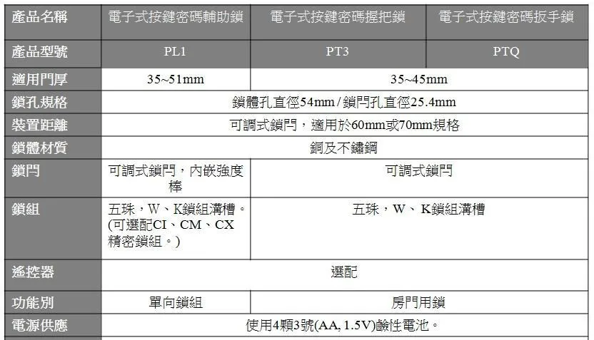 台製電子密碼按鍵鎖系列,共有輔助鎖,握把鎖及扳手鎖三種款式。輔助鎖可搭配大把手鎖安裝於