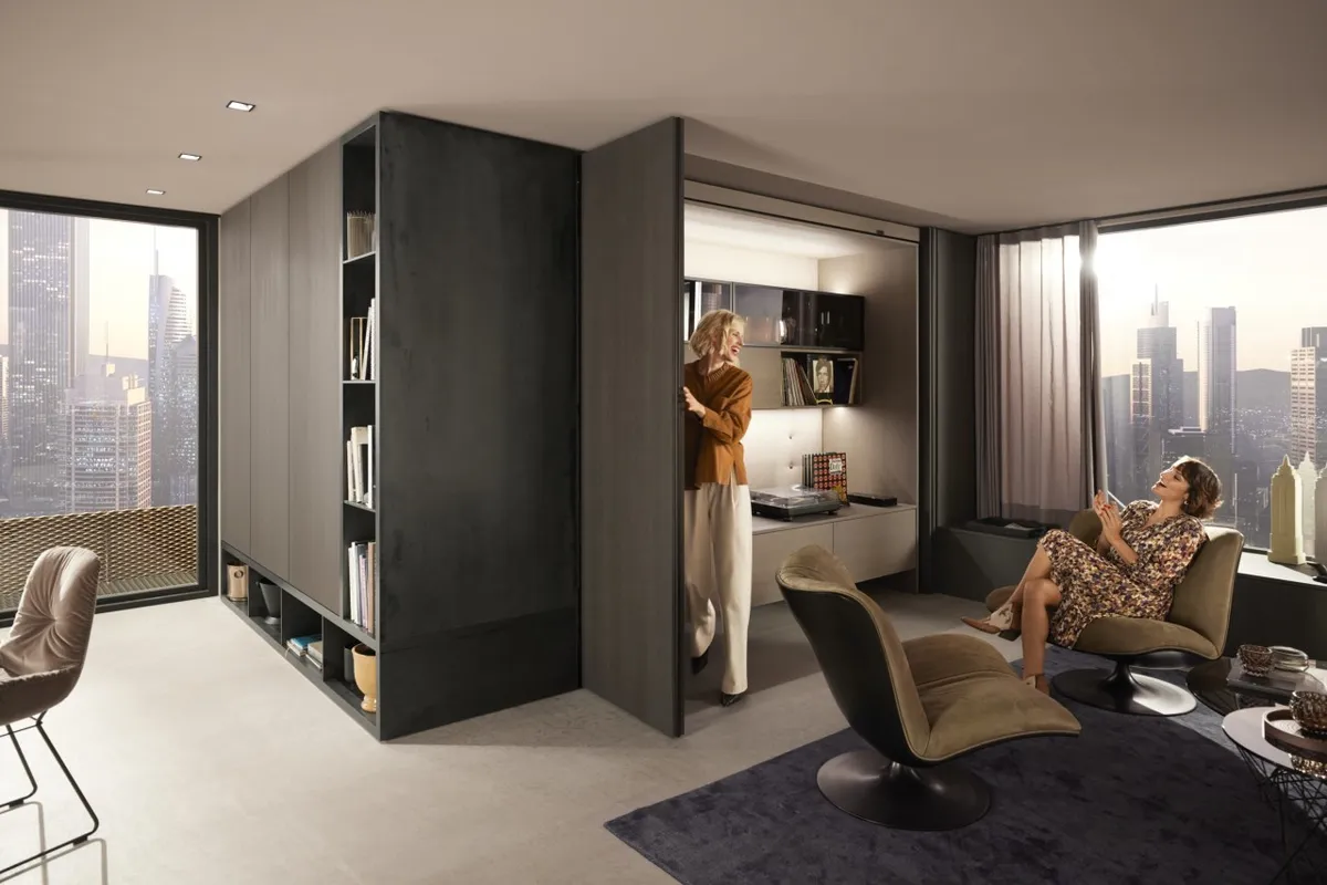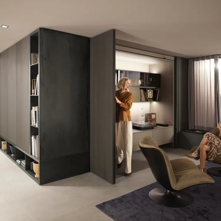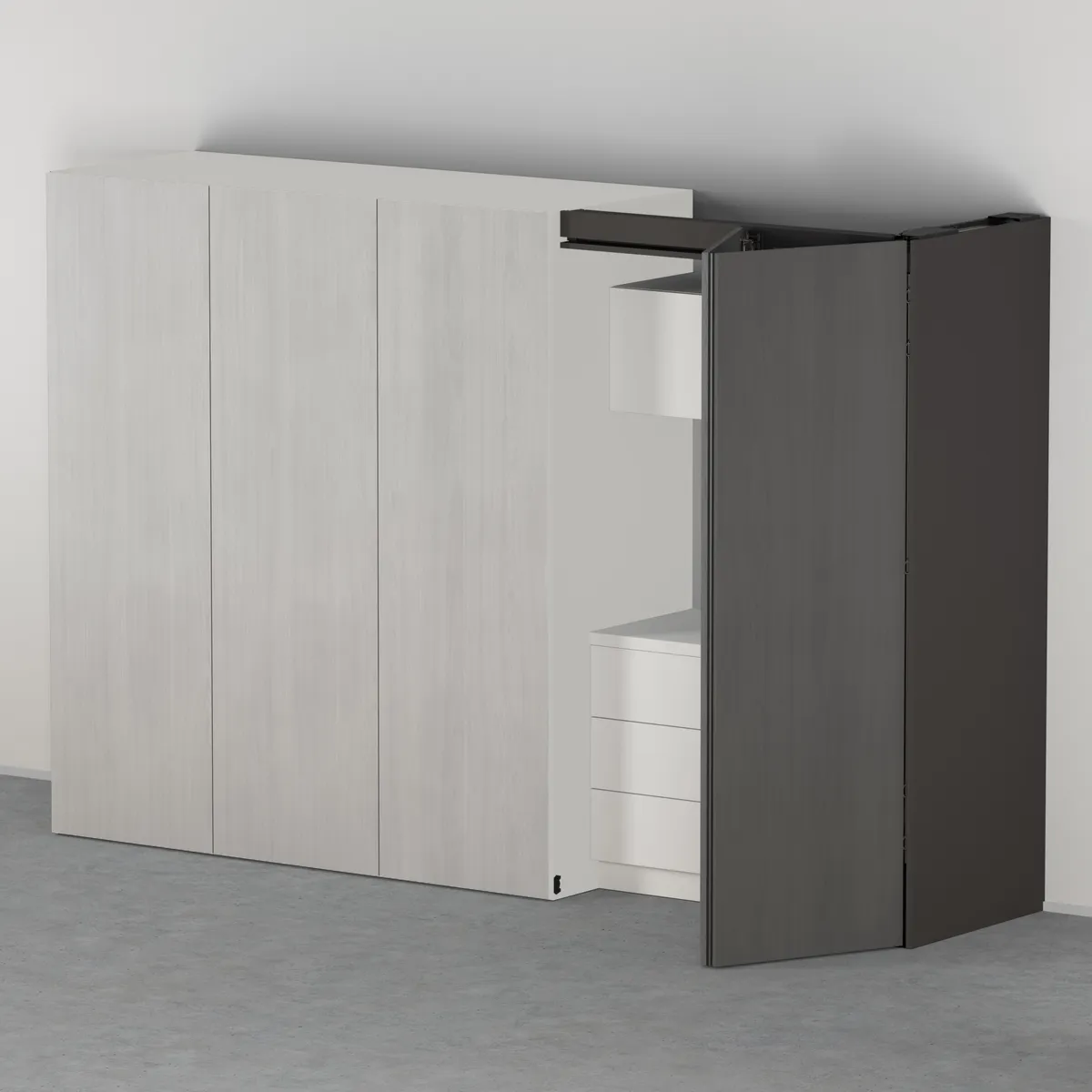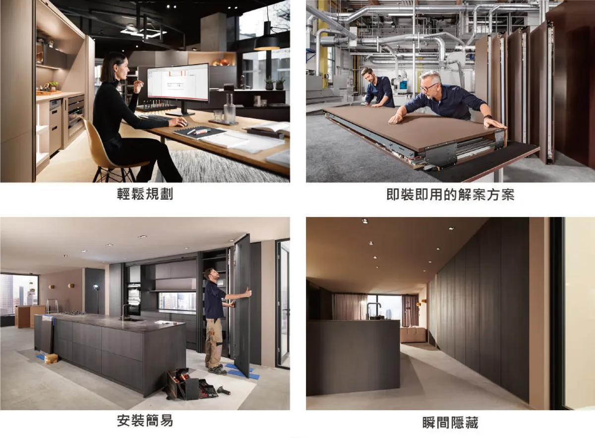 全新產品類型 - 魔力彈壓緩衝推入軌系列能創造出多功能生活空間。REVEGO - 獨樹一格具備高端內置技術,你能隨時按需要打開或隱藏整個生活空間。無論是單門還是雙門應用,全蓋面板都能收納於專用的窄櫃中。