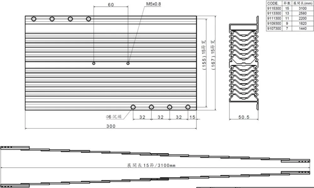 超延展型鋁合金伸展滑軌,最短收長僅30公分,依照滑軌節數對應不同最大展開長,1.4公尺 ~ 3.1公尺輕鬆拉展。