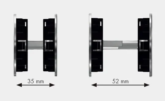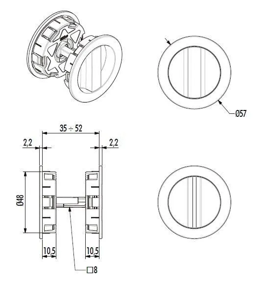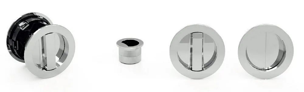 適用門片厚度35mm到52mm。旋鈕及底座為純銅材質,質感好,安裝簡單,直接挖48mm孔嵌入,即可固定,不需鎖螺絲;操作滑順流暢,原廠包裝內另附有同造型及同顏式之圓型戶引手。產品顏色有鋁刷線及亮鉻色兩種。