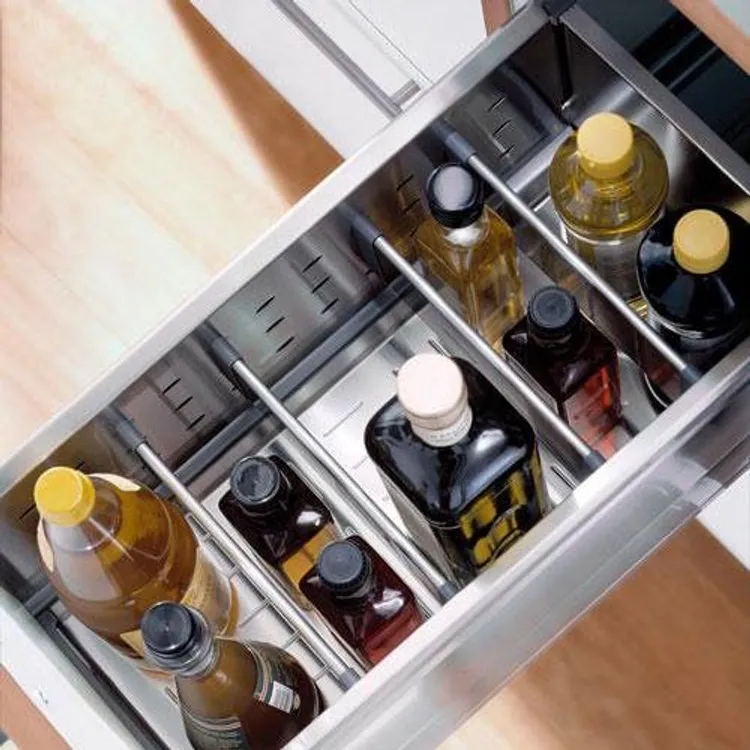 blum 瓶罐組+不鏽鋼滴水盤: 不同高度的瓶子都可在面板高抽裡安全擺放,靈活的橫隔板片能提供支撐固定,醬醋油等觸手可及,清潔衛生的瓶托盤由不鏽鋼製成,便於清潔。 產品優點: 1. 外型質感佳,能與 blum 滑軌做最佳的結合。 2. 為您打造井然有絮的儲藏空間。 3. 特殊的設計,能依需求,彈性調整隔板的大小與間隔。 4. 不論抽屜大小寬度,都能搭配使用。 5. 不鏽鋼滴水盤可取出,清潔容易。 6. 取代傳統台製小側拉籃,儲物空間更大。 應用範例 操作影片