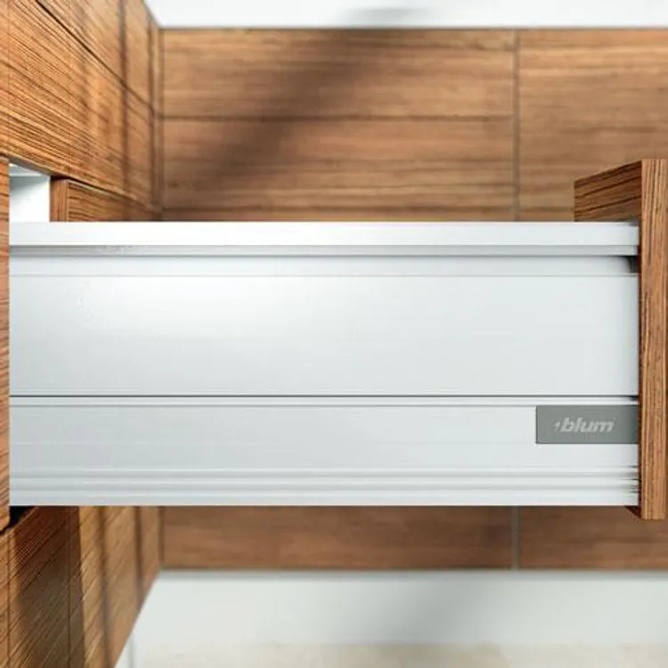 blum 的 TANDEMBOX 豪華金屬鋁灰抽滑軌,經過數百萬次的實踐證明,平穩順暢滑行的性能讓廣大客戶為之驚豔。BLUMOTION 緩衝阻尼則打造出輕柔關閉效果。完善的產品線(低抽、中抽、高高抽)和多功能內裝分隔配件,讓您能在面對客戶多樣化需求時,輕鬆找到合適的解決方案以及應用設計。