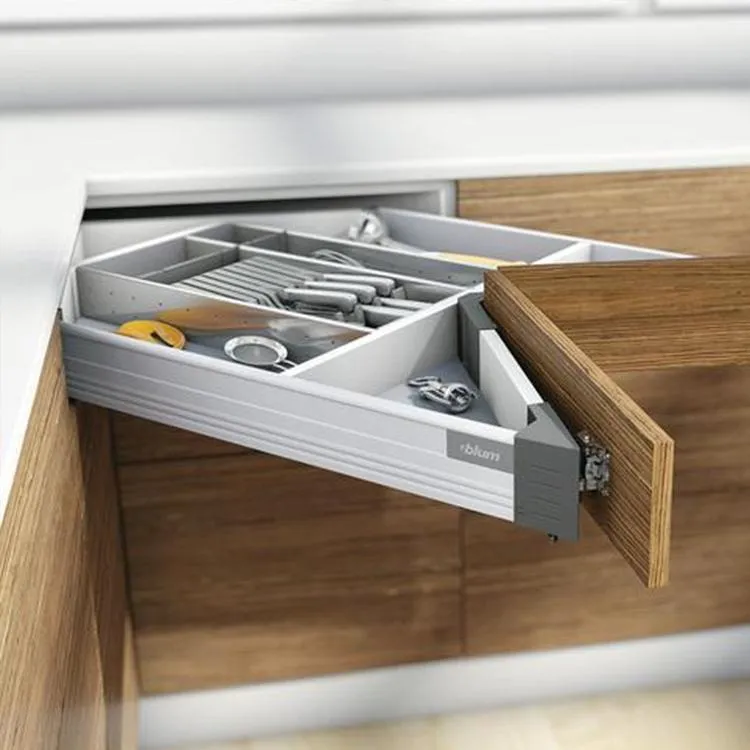 相對於傳統的角抽解決方案,我們推出了 blum SPACE CORNER 專用角抽。這樣,您就可以在角落處輕鬆而一目了然,拿取碗盤刀具(擺放在 blum 的不鏽鋼刀具架内)和各類鍋具。現有的角落空間得以最佳利用。
