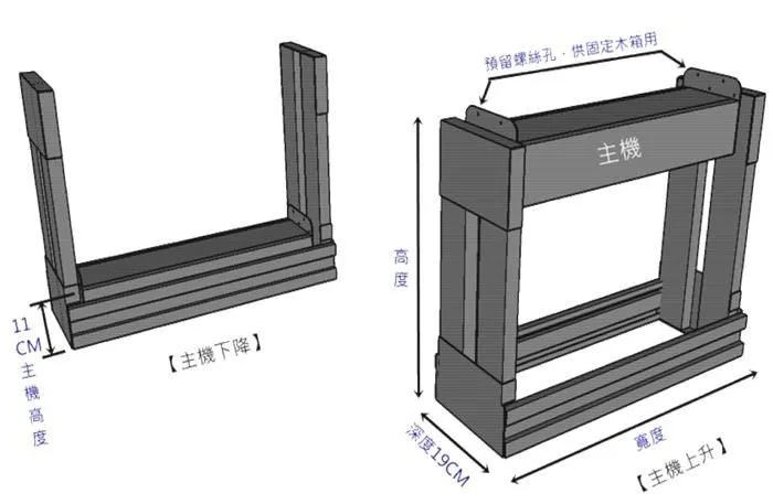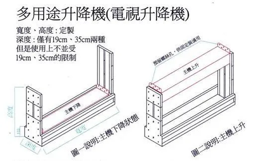 2.尺寸規格:升降機長度、寬度、高度皆可定製,深度只有固定19cm、36cm,但是使用上不受19cm、35cm之限制。