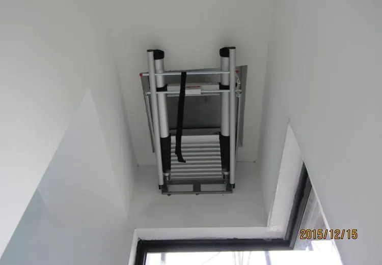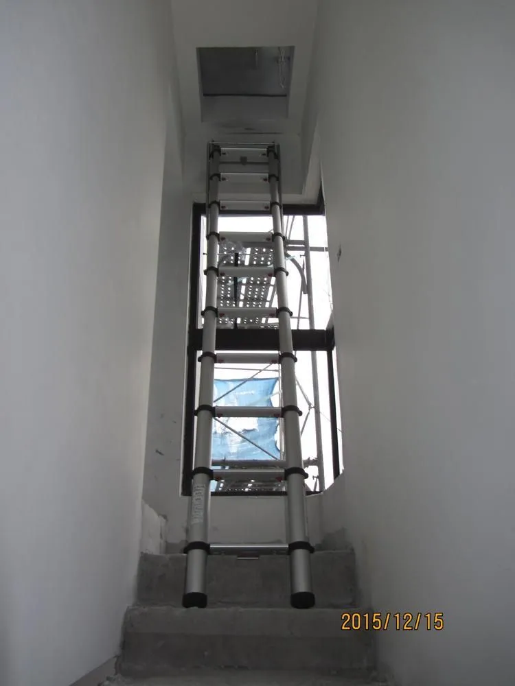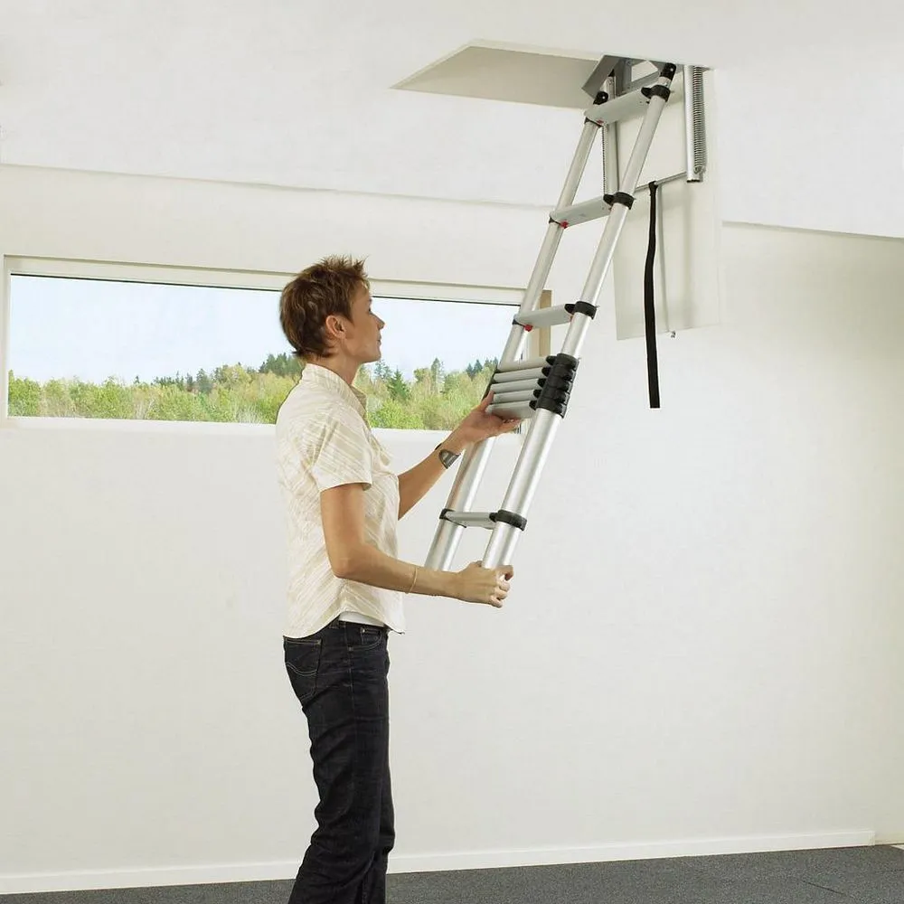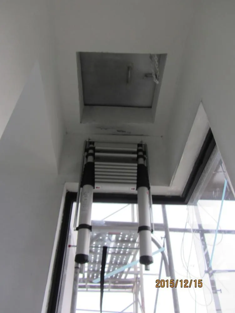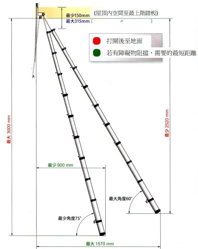 產品說明:伸縮閣樓梯(伸縮梯)收納容易,不佔空間,能放置於閣樓間,安裝簡單,使用輕鬆。特別適用於閣樓或太陽能(綠建築)(斜)屋頂使用。專利伸縮扣設計,操作簡易,只需輕輕一壓伸縮扣,即可輕鬆收納梯子。特殊鋁,鎂鈦合金煉製,耐重力強,總重量輕,單人攜帶操作自如。產品規格:適用天花板高度:250 - 310cm,不含框及面板。最小挖洞尺寸:550 x 1000 mm。可承受重量:136 kg。 應用範例